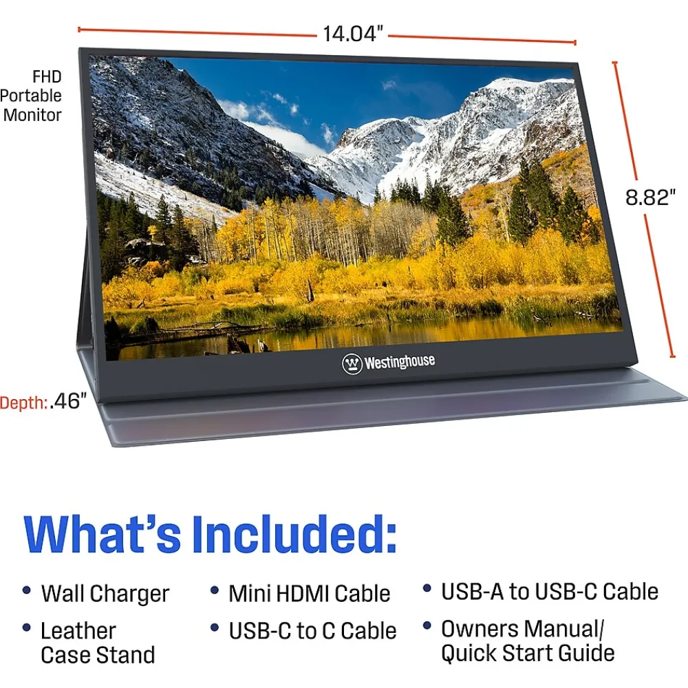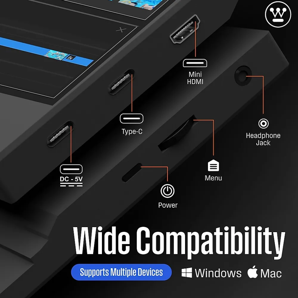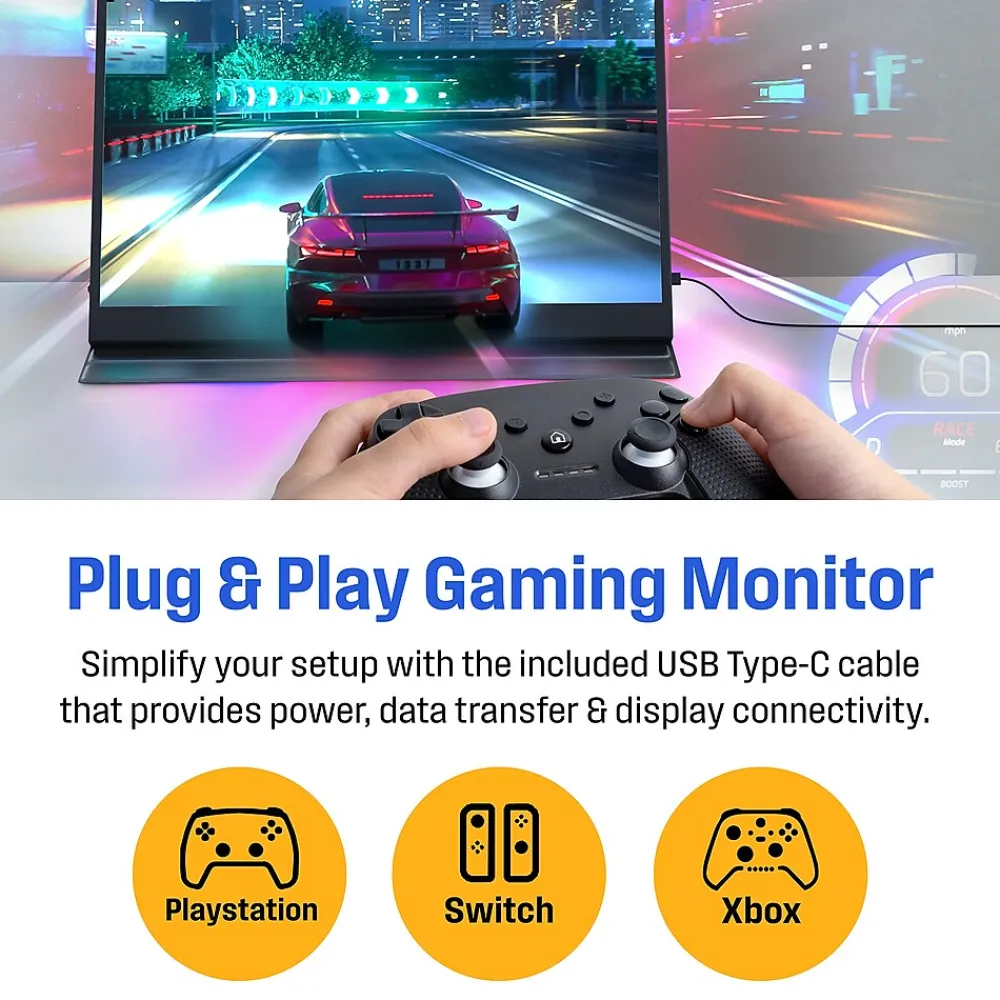 This monitor is built with an IPS panel that delivers superior visual clarity with its higher color accuracy, color and brightness screen uniformity, as well as wider viewing angles. Its slim and compact design makes it ideal for business trips and general travel setups. The included magnetic protective cover also doubles as a monitor stand for convenience. Utilize as an external monitor to expand your desktop real estate and enable efficient multi-window management for enhanced productivity; OR use as a dedicated display for casual console gaming. Our portable monitor comes with internal built-in speakers that deliver rich and robust audio for virtual calls, meetings, gaming, and content consumption, allowing you to keep your work or personal desk setup clean and clutter-free. Featuring multiple connectivity options with mini-HDMI, USB Type-C, and a headphone input. The USB-C port supports both video output and power delivery, enabling single cable connectivity for laptops with Thunderbolt or DisplayPort Alt Mode support.