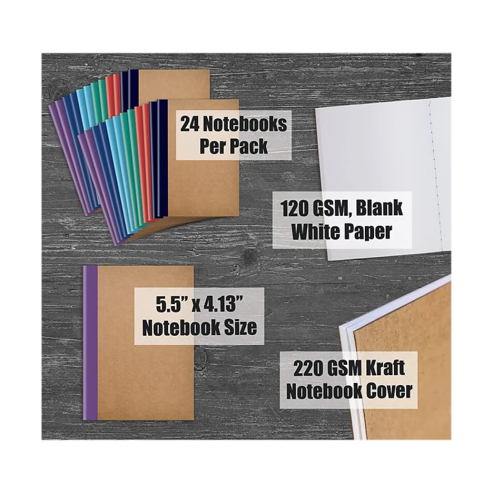 - Each notebook contains 24 sheets measuring 4.13″ x 5.5″