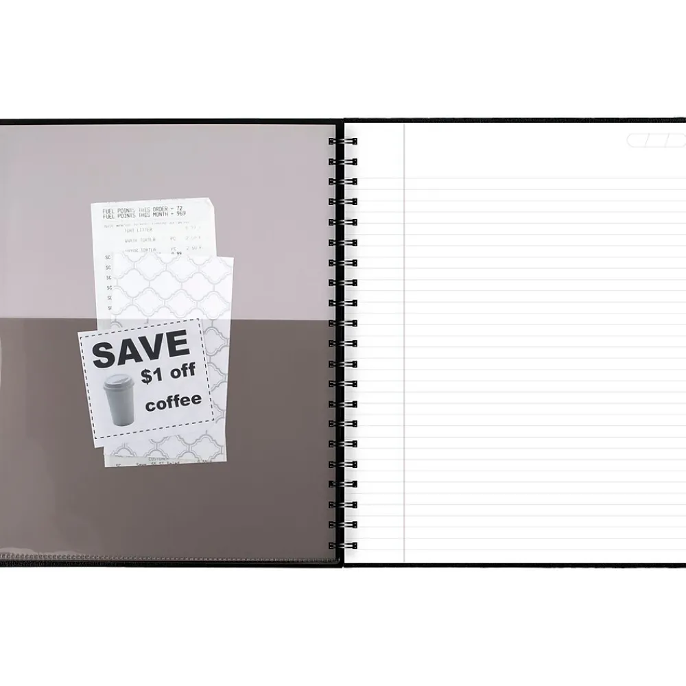 Handle everyday note-taking needs with this hardbound spiral business notebook. Each page is legal-ruled to let you write with large letters for strong readability, while the black paper-based linen cover provides durability and a sleek appearance. This Cambridge hardbound business notebook features a poly pocket for quick access to small accessories and loose pages, while the label page offers customization options.