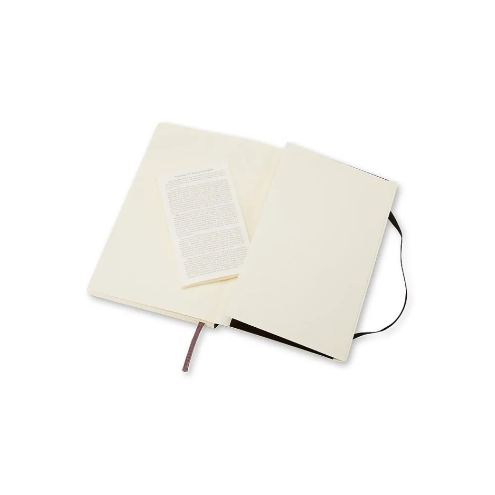 This reliable travel companion, perfect for calculations, thoughts and passing notes, has a cardboard bound cover with rounded corners, acid free paper, a bookmark, an elastic closure and an expandable inner pocket that contains the Moleskine history.