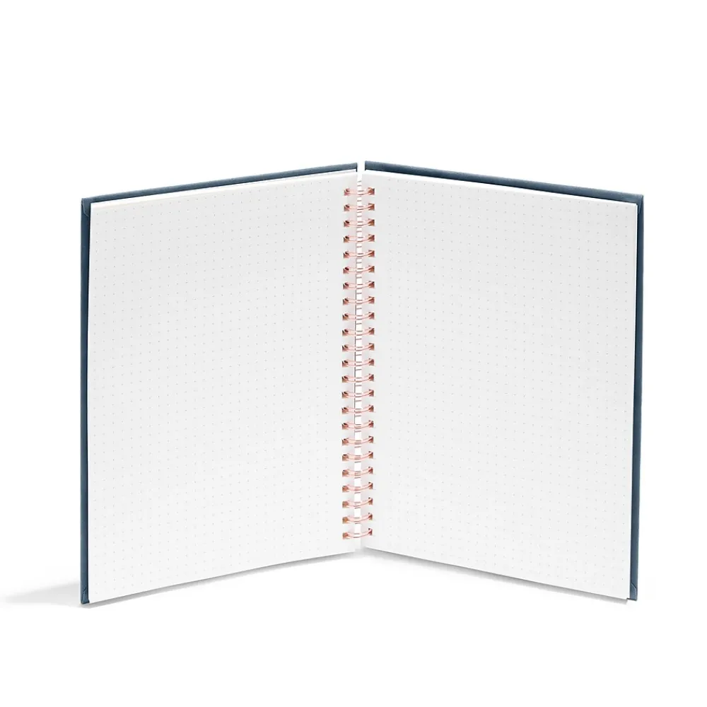 Keep journal entries, assignments, and other notes in one convenient place with this medium notebook. The spiral binding has a copper finish for added shine and allows for quick, simple page turning, while the velvet exterior offers a soft, luxurious look and feel. This Poppin storm medium Velvet spiral notebook has a hard cover, standing up to wear and tear and providing enhanced protection to contents.