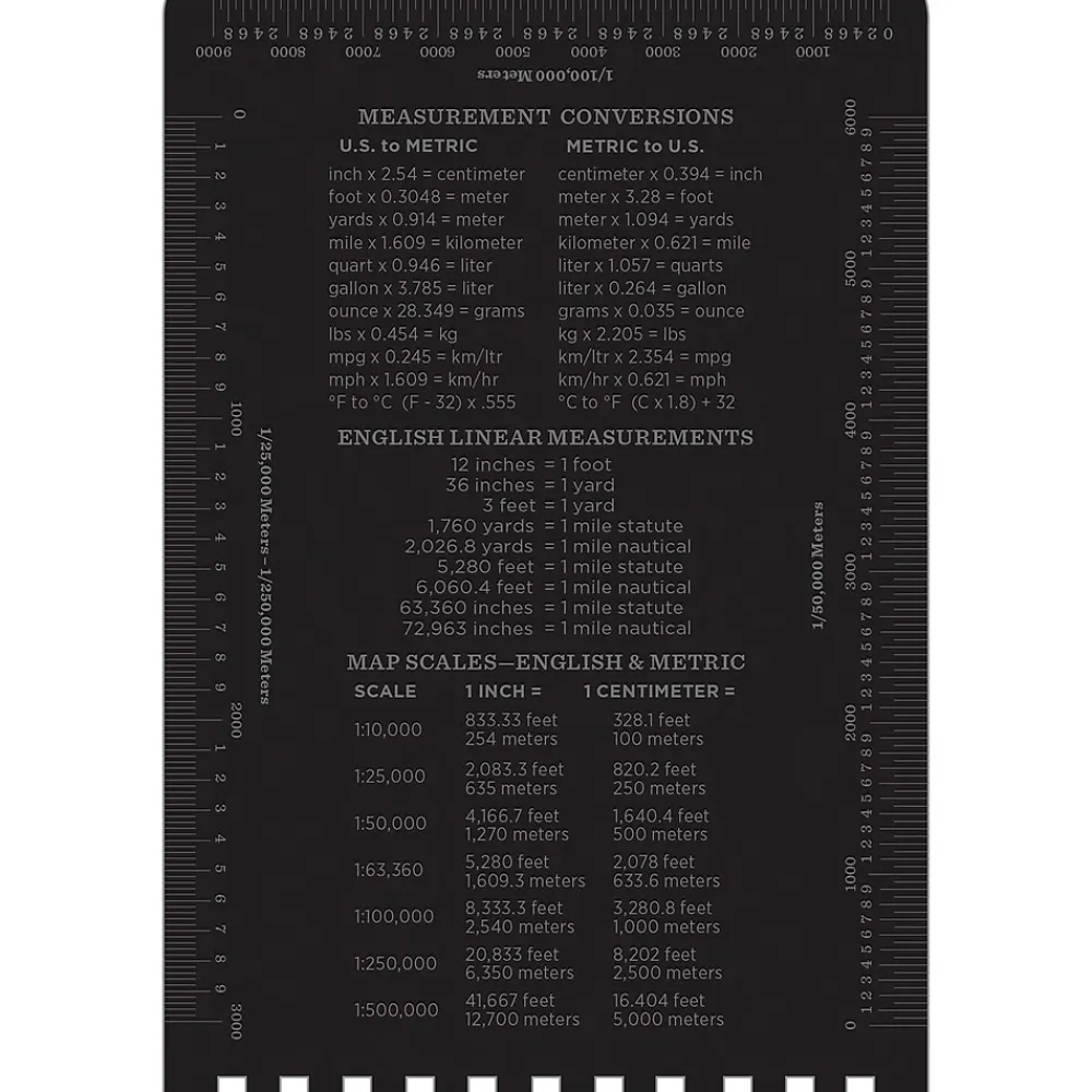 - Rulers, conversion charts, and map scales printed on the cover prove handy in the field