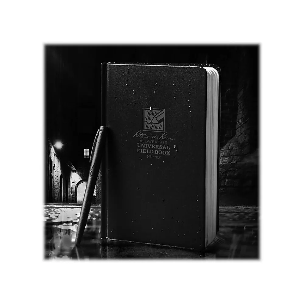 This Rite In The Rain All-Weather Universal 4.75″ x 7.5″ hardbound notebook is discretely sophisticated with its black Fabrikoid cover and subdued light gray tinted paper. Everything from the cover, paper, sewn-in pages, and even glue is designed to survive mother nature’s wrath.