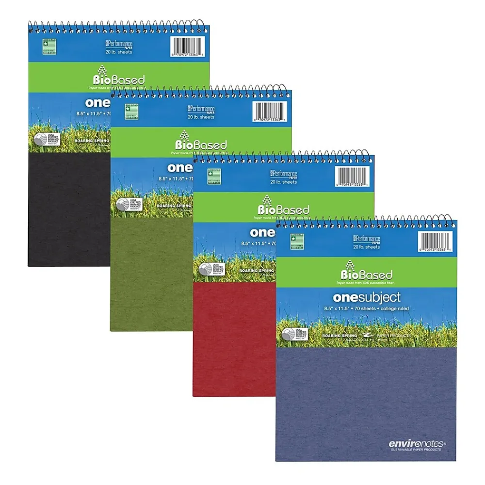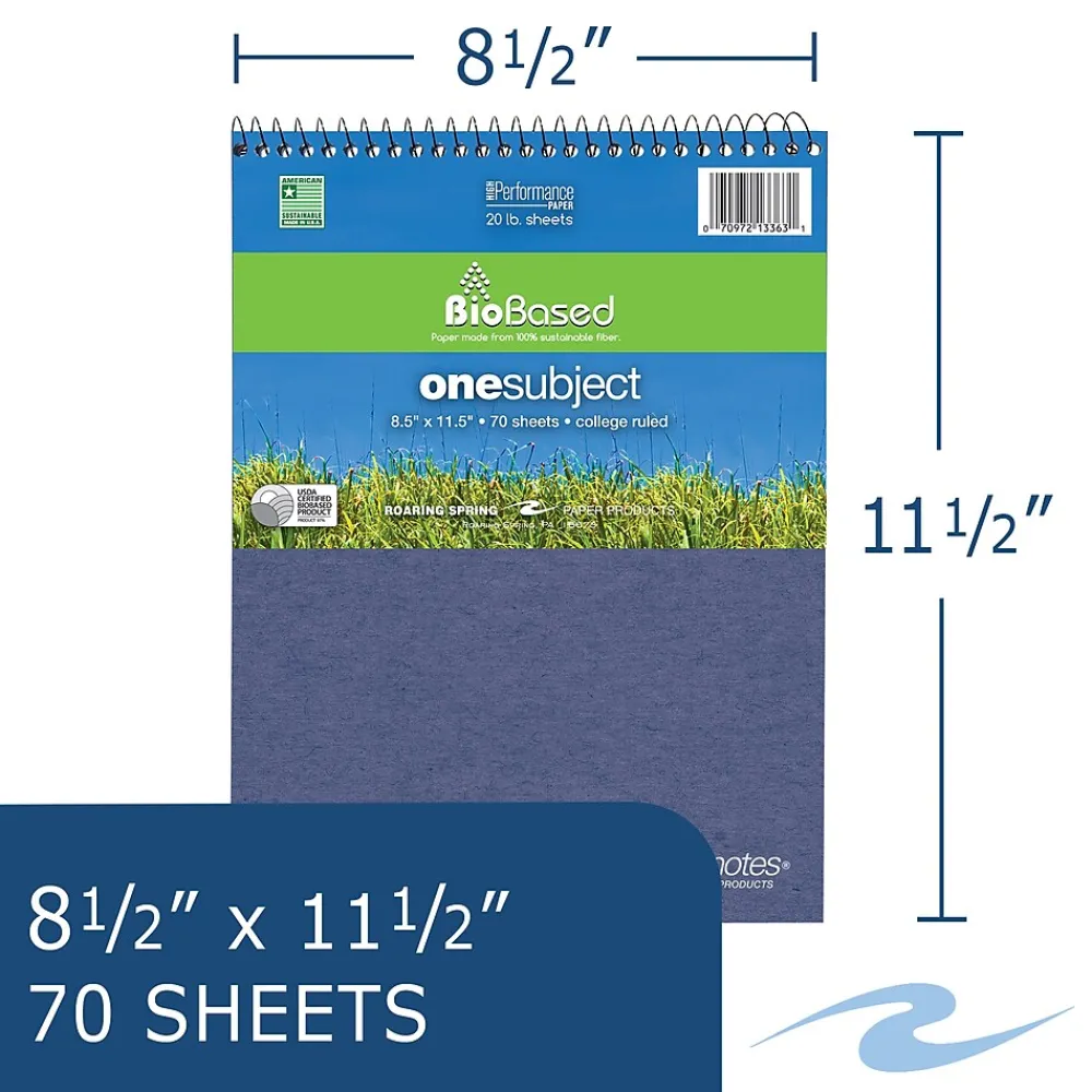 Record your notes in premium quality top opening college ruled notebook featuring high performance20 lb.heavyweight recycledpaper with 30% post consumer waste.Notebook features attractive Earthtone front covers and the back cover is a heavy-duty 80 pt. grey chipboard. Paper has college ruled blue lines and a red margin line, and is perforated at the top for easy removal. Wire ends are coil-locked for snag-proof performance. Each book is 8.5″ x 11.5″ and contains 70 sheets of writing paper.This product is USDA biobased certified and proudly made in USA!