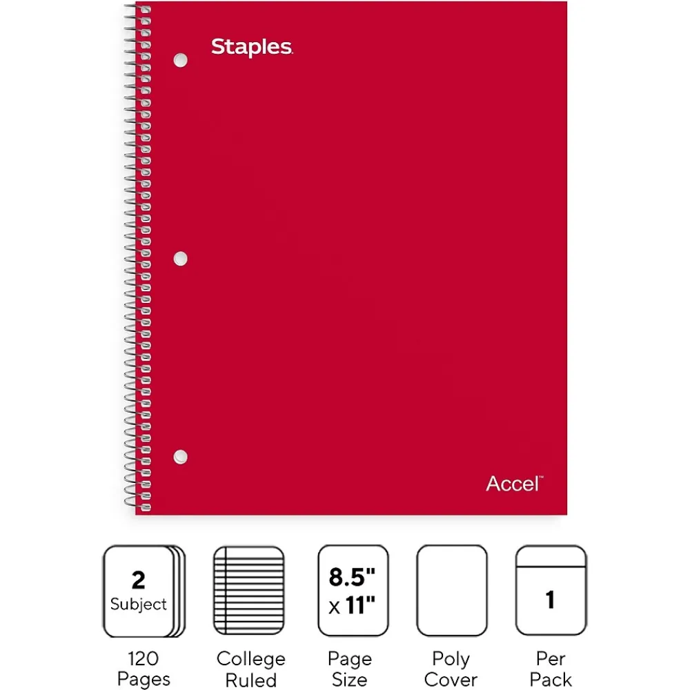 Notebooks|Staples Premium 2-Subject Notebook, 8.5″ x 11″, College Ruled, 120 Sheets, (TR58312) Red