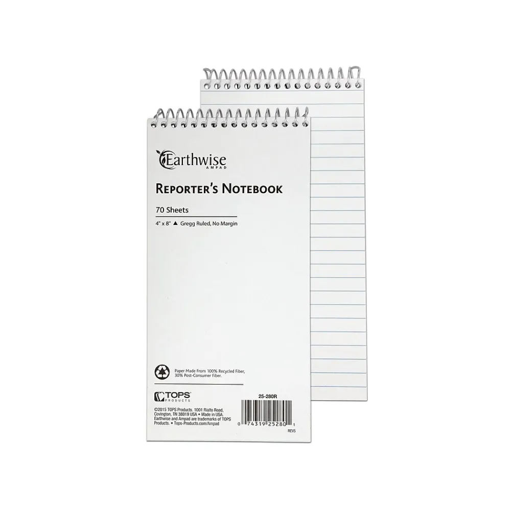 Make lists and write notes with this white reporter notebook. The Gregg ruling of this notebook lets you organize your notes efficiently, while the compact size makes it easy to store in a purse, bag or briefcase. Each Earthwise by Ampad reporter notebook has 70 sheets of paper and features a sturdy backing for writing notes while away from your desk.