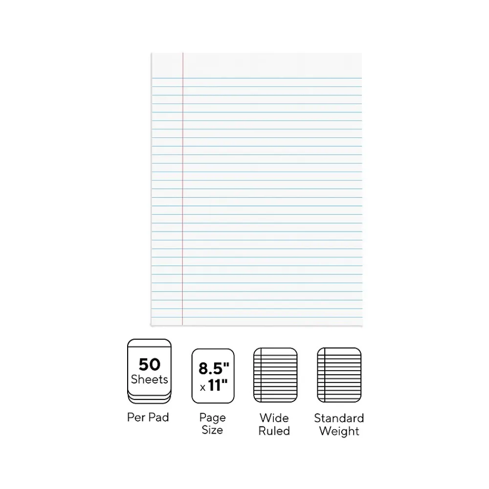 Complete your set of work desk essentials with these white glue-top 50-sheet notepads. The wide ruling helps keep your writing neat and easy to read, while the 50-sheet pads let you create multiple drafts and polish your documents. These Staples 8.5 x 11-inch white wide ruled notepads have a top-bound design to let you flip through the pages.