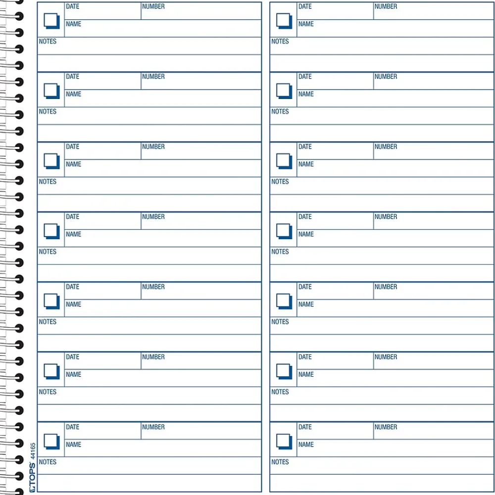 The cover flips back for easy writing in the car or at a payphone. 8-1/2″ x 8-1/4″, 14 messages per page, 1,400 messages per book, 5 books per box.