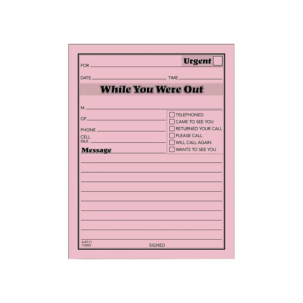 Take down names, callback numbers, and other important information with these While You Were Out pads. The bright pink color captures the eye to prevent important messages from being missed, and the preprinted forms provide dedicated spaces for contact details and notes. With 50 sheets per pad and 12 pads per pack, these TOPS While You Were Out Pads provide an ample supply for offices, reception desks or other professional settings.