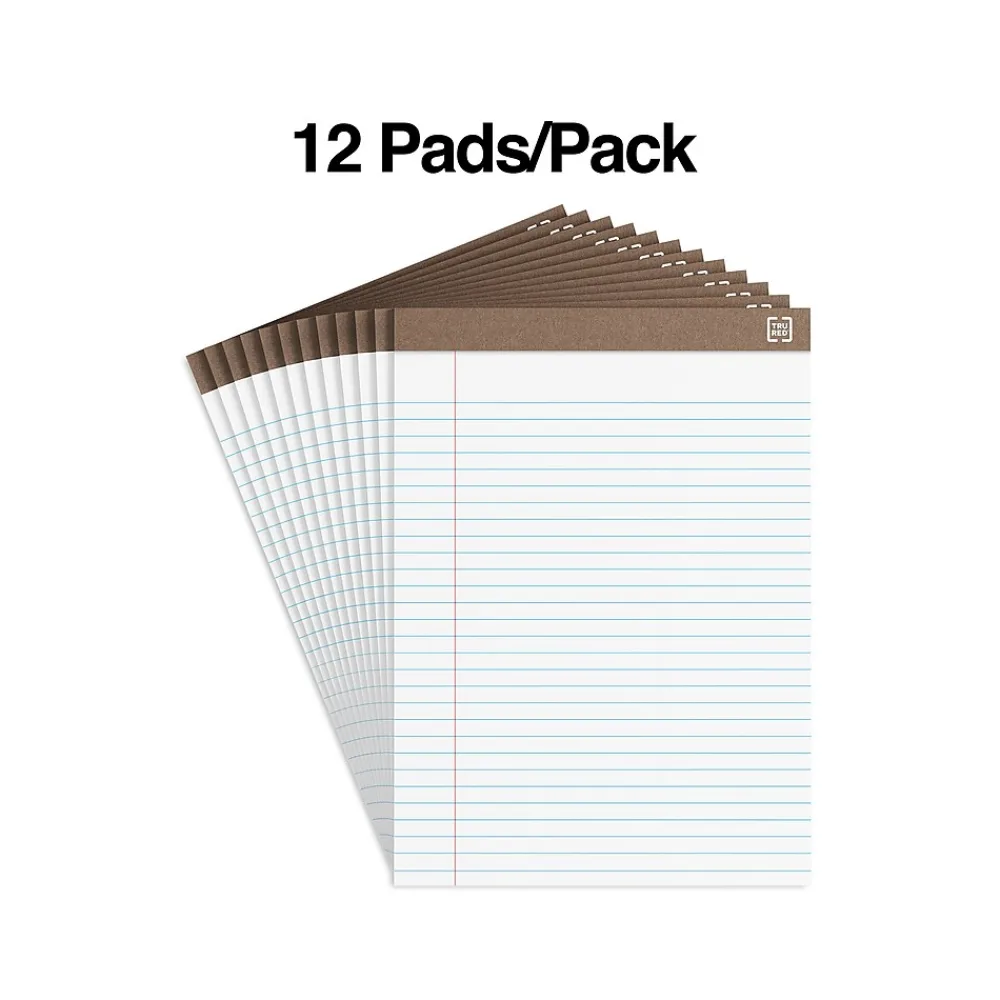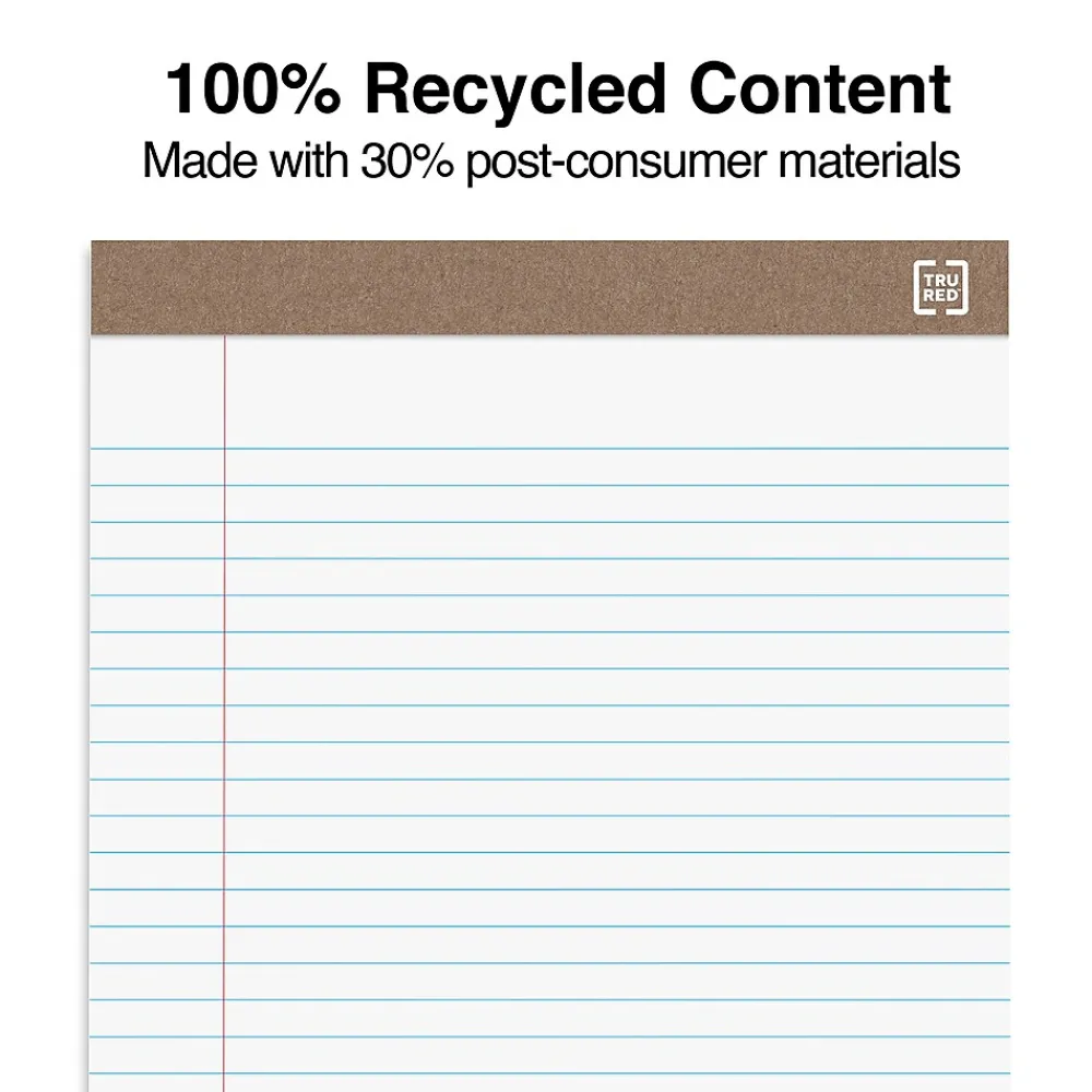 Write letters, lists and ideas on these white 50-sheet notepads. The wide ruling keeps your writing neat and contained for legible reading, while the top-bound design makes it easy to flip through pages. These recycled TRU RED™ Eco-ID 8.5 x 11.75-inch white wide ruled notepads have perforations so you can quickly and cleanly peel off a page.