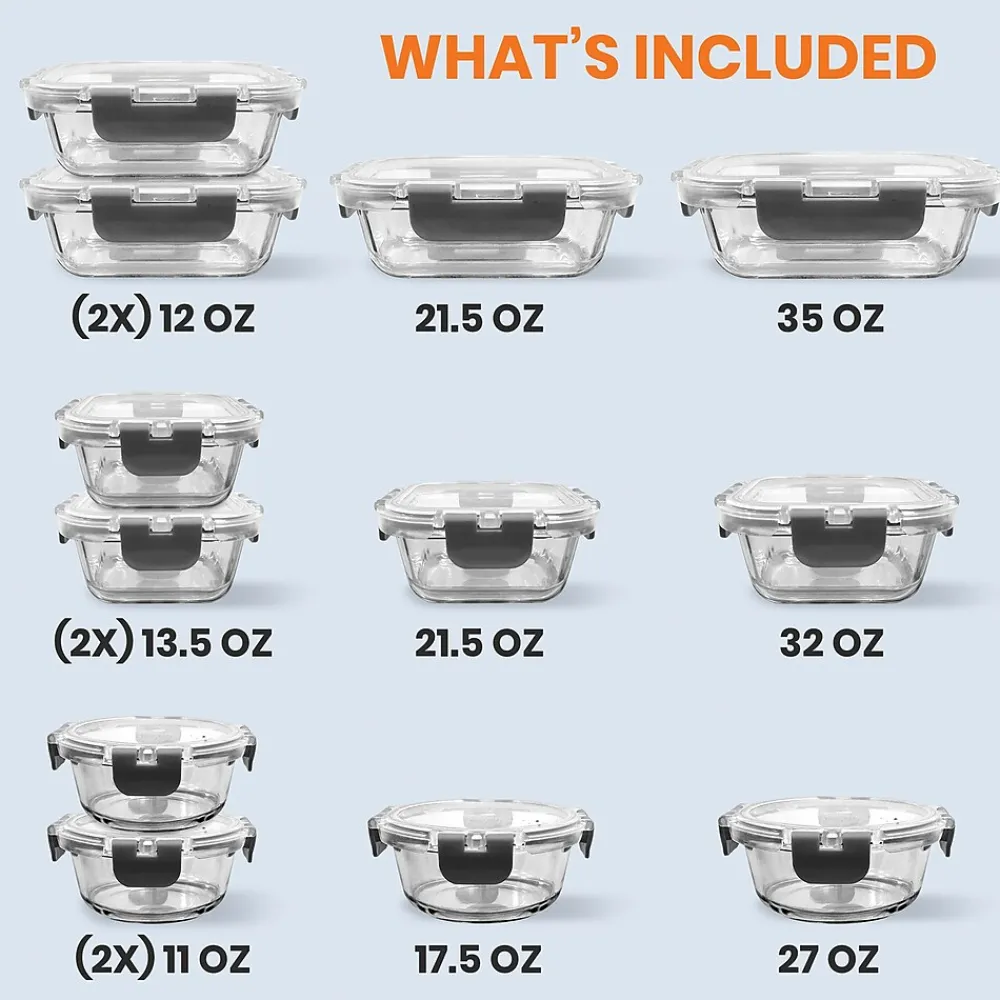 - 24-piece containers set includes 12 containers of various sizes with matching lids