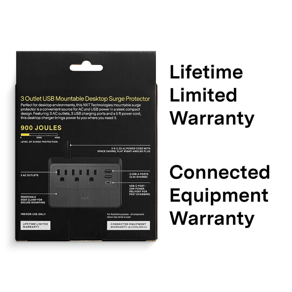 Introducing the NXT Technologies mountable desktop charger with three outlets, two USB Type-A (2.4A), and one USB Type-C (18W) ports. Its mountable design offers convenient access to power while saving space. With advanced surge protection, it ensures safety for your devices. Purchase this upgrade today for efficient charging in a compact form.