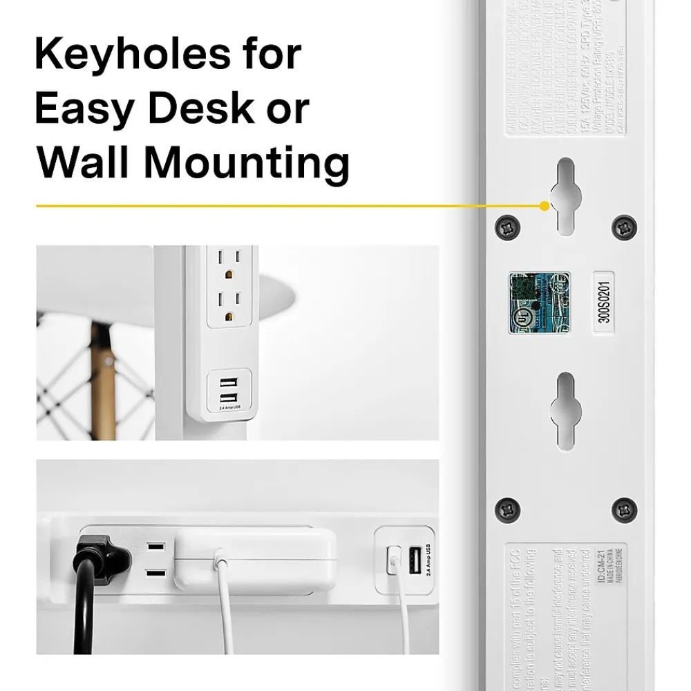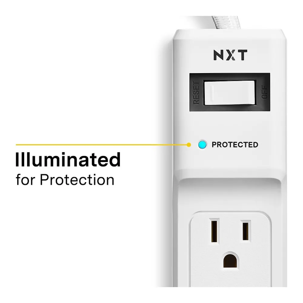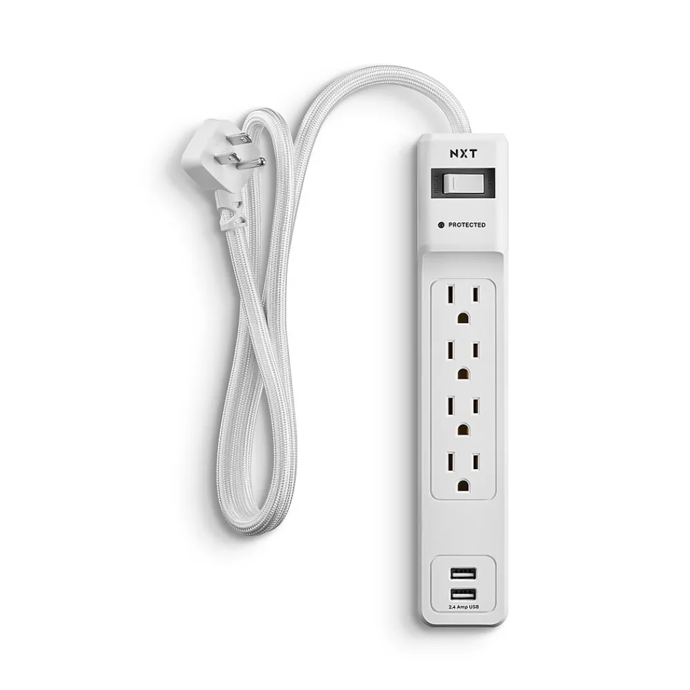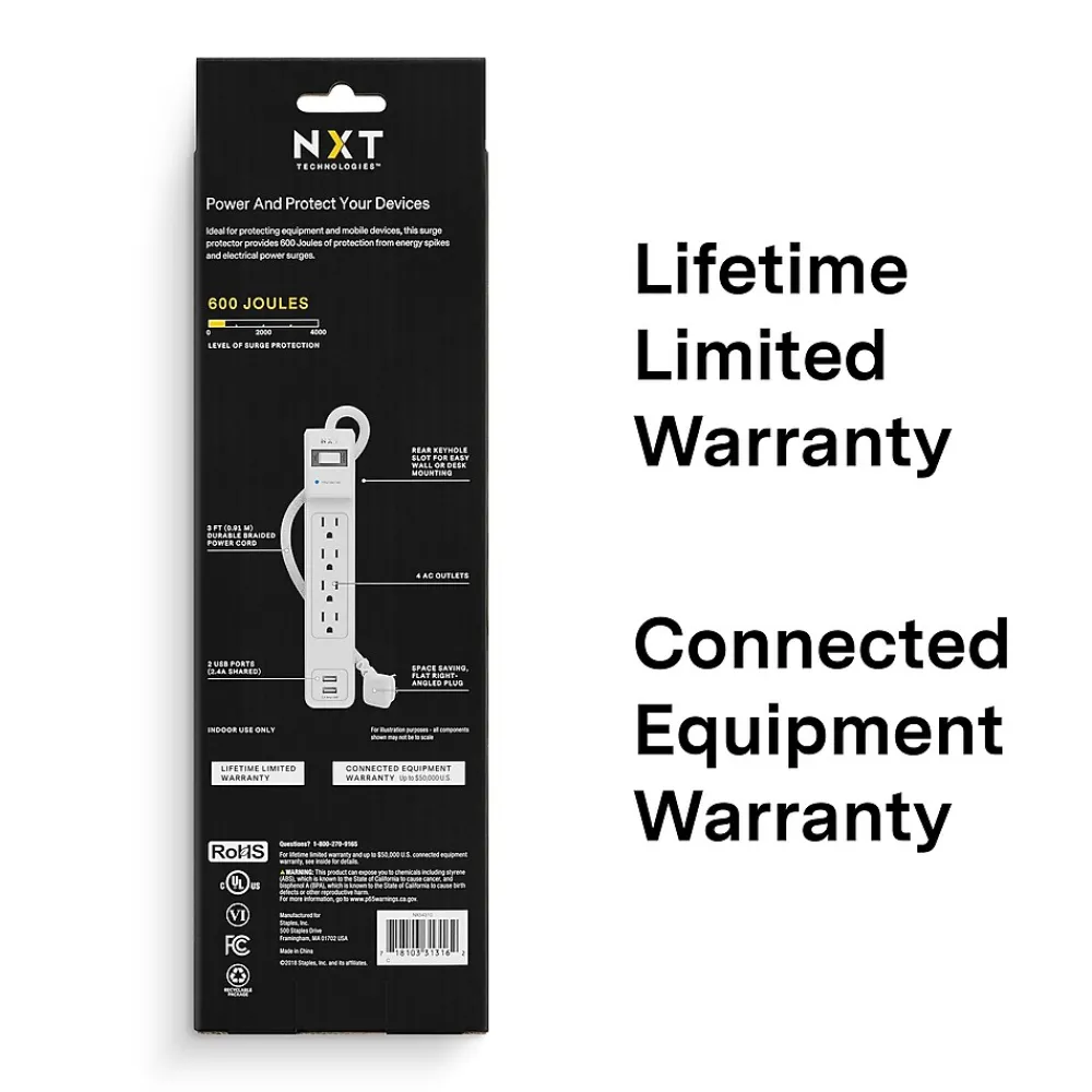 Protect delicate electronics and data from power surges with this four-outlet surge protector, which features flexible placement options in a slim design. Two USB ports let you charge compatible devices while you defend your electronics, and the 3-foot cord length fits neatly behind existing electronics or under your desk. With 600 joules of surge protection, this NXT Technologies™ four-outlet USB surge protection is an ideal option for setting up singular workstations and office cubicles.