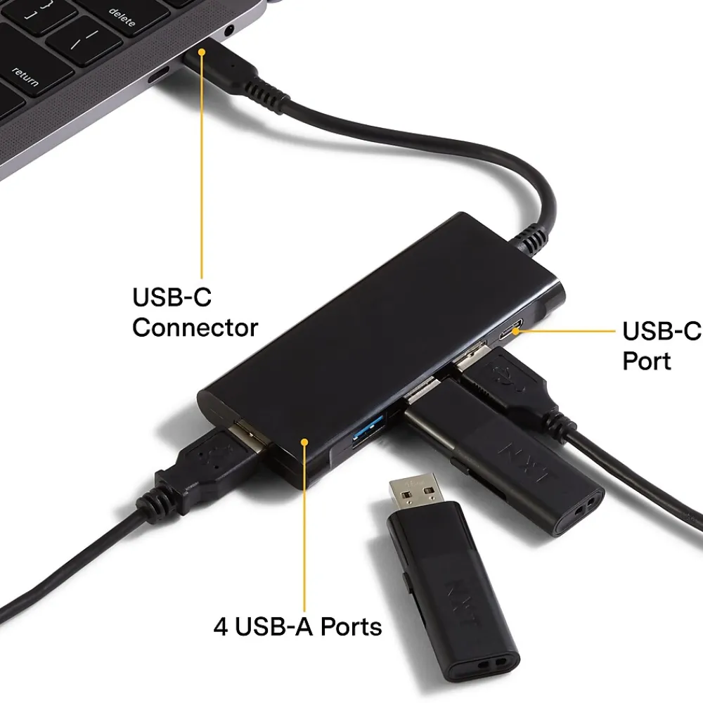 Add four USB ports to your USB-C laptop port with this connectivity hub. Featuring transfer speeds of up to 5Gbps, this adapter supports fast file copying and smooth video rendering. This NXT Technologies four-port USB-C to USB-A hub has a resilient design that endures up to 10000 bend cycles.