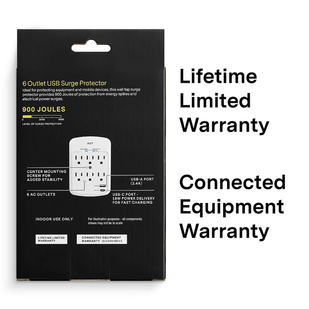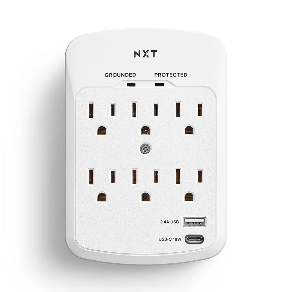 - Surge protector adapter features six grounded AC outlets, one USB Type-A port, and one USB Type-C port for convenient powering of multiple devices such as phones, tablets, and monitors all at once