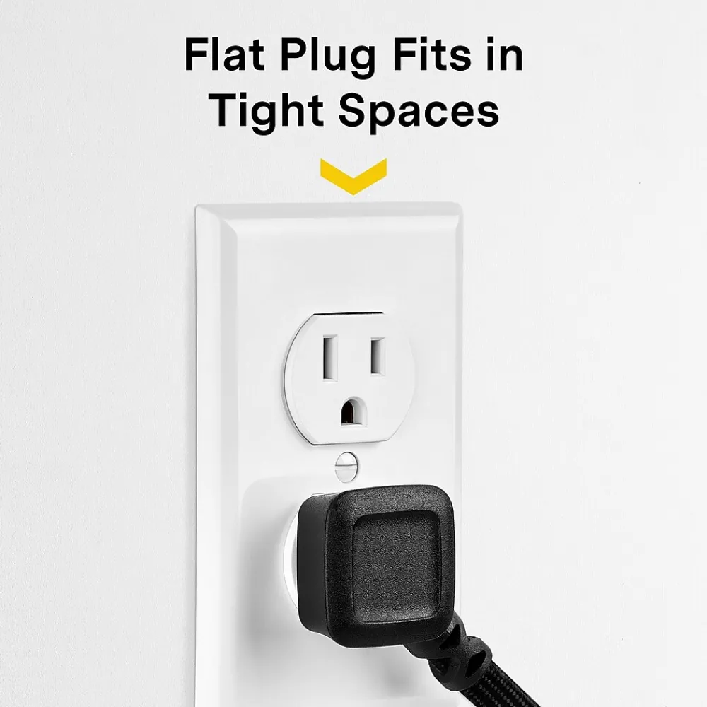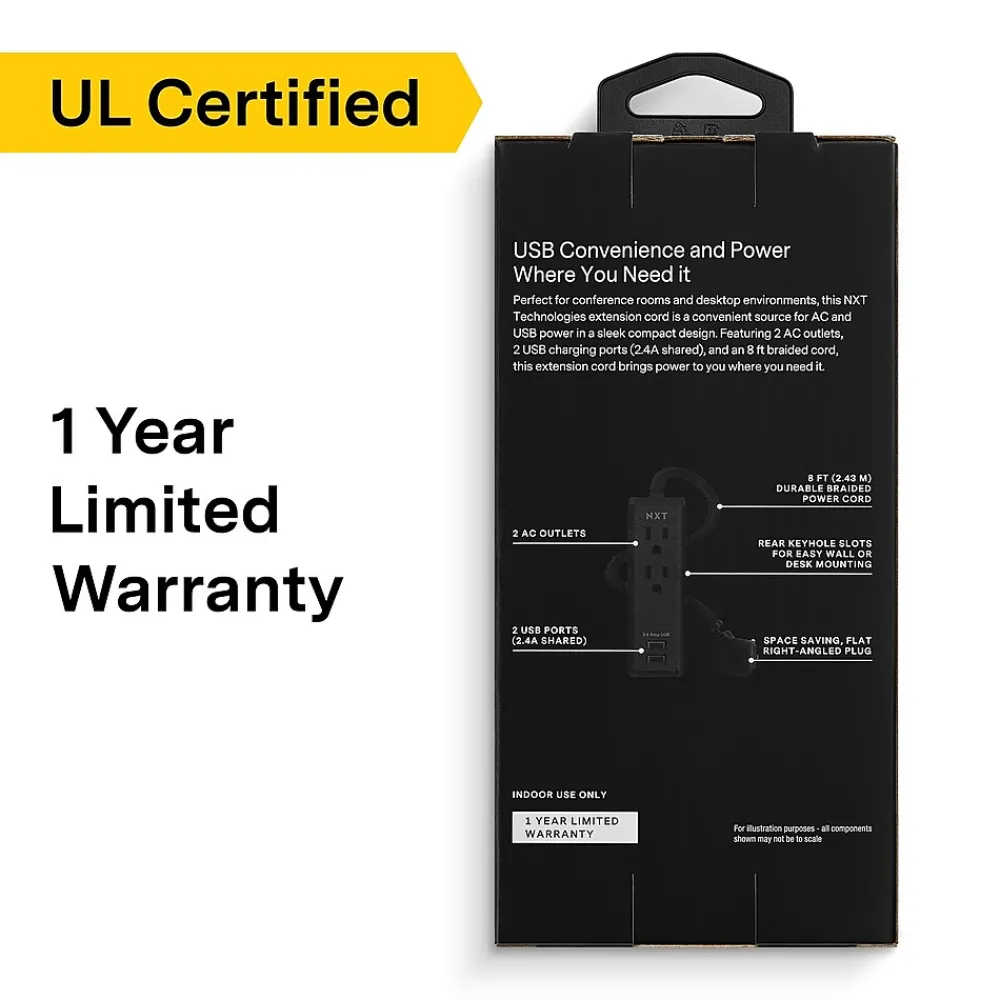 Charge two USB-enabled devices, such as a phone and tablet, and power up a computer and printer all at the same time with this extension cord. The braided exterior lends durability and protection against everyday wear and tear, while the space-saving right-angled plug fits hard-to-reach power sources. This NXT Technologies™ two-outlet two-USB extension cord has a sleek compact design that blends with most office and environments.
