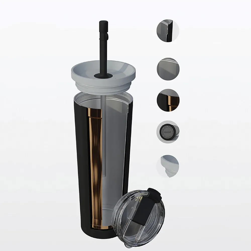 - Dual lids: leakproof lid with straw and sliding, flip-open lid
