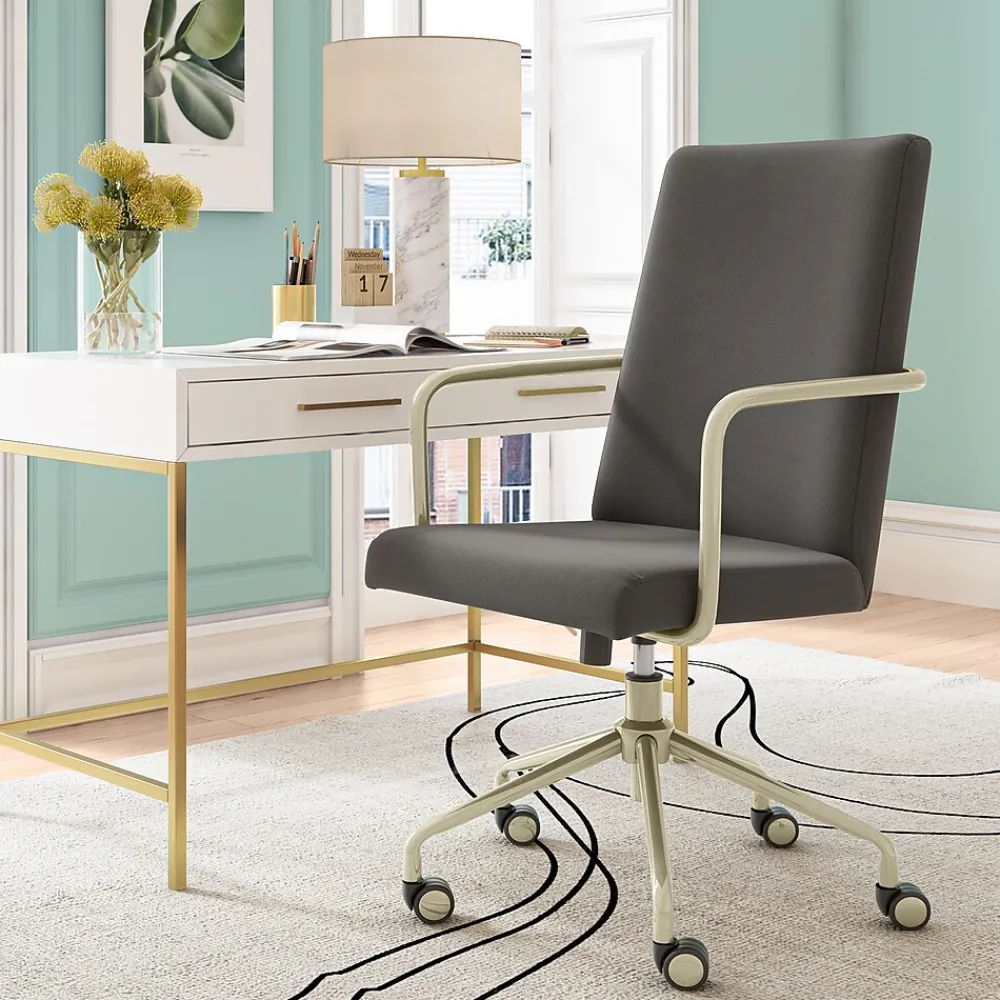 Turn your office space into a creative space with the Elle Decor Giselle desk chair. Chic and modern, this computer chair is decked head to toe with cool features. Its mid-century modern design features lustrous, gold metal trim on the arms, base, and wheels. Its butter-soft velvet fabric and high back will make you feel like an executive while the ergonomic seat cushion will keep you comfortable. Cute and versatile, this office chair adds a touch of elegance to any home office, teen girl’s bedroom, or dorm.