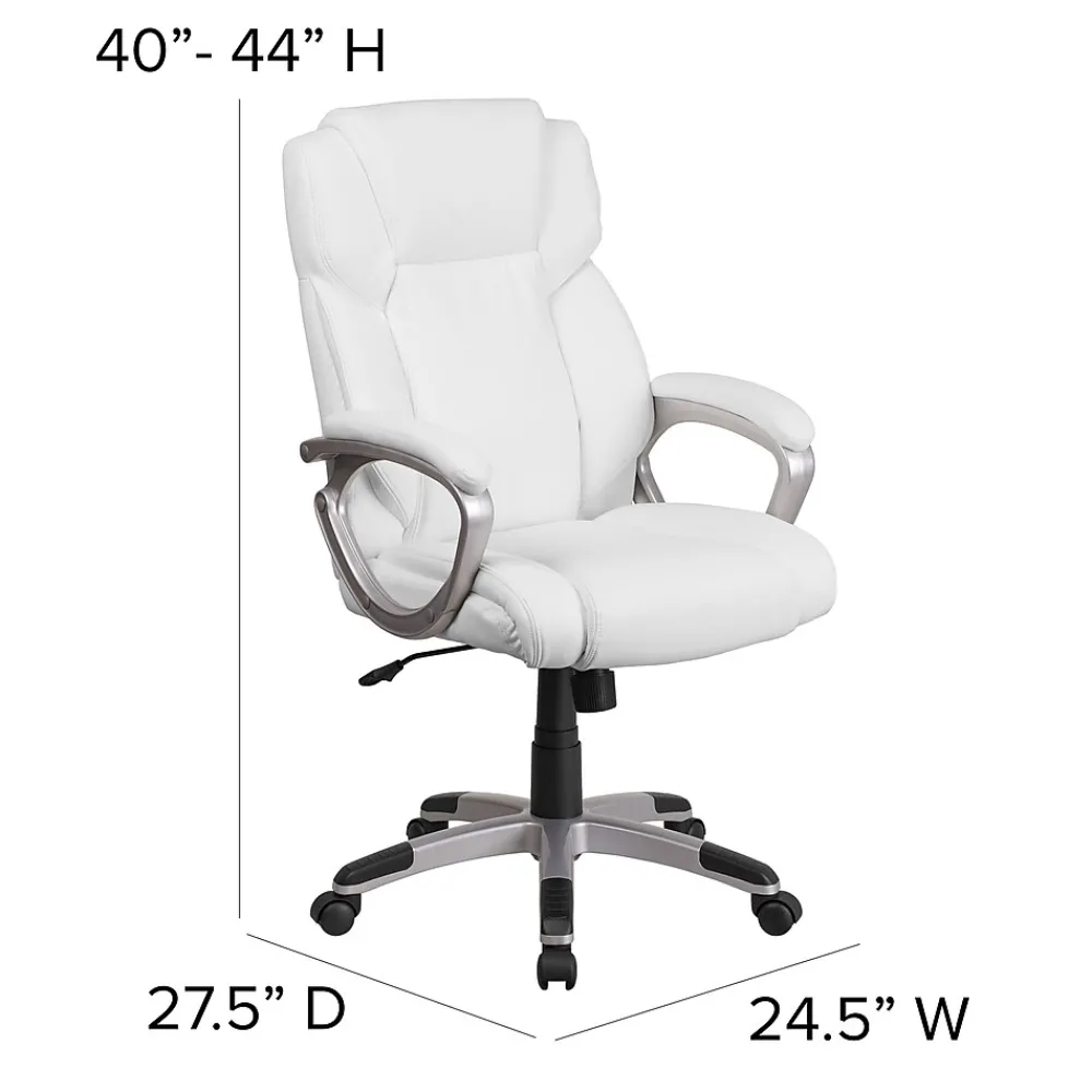When impeccable form follows precise function the result is this black executive LeatherSoft office chair that offers a stylish appearance as well as custom comfort. The mid-back design provides support to the mid-to-upper back region. LeatherSoft is leather and polyurethane for added Softness and Durability. Turn the tilt tension adjustment knob to increase or decrease the amount of force needed to rock or recline. Lock the seat in place with the tilt lock mechanism. The waterfall front seat edge removes pressure from the lower legs and improves circulation. Chair easily swivels 360 degrees to get the maximum use of your workspace without strain. The pneumatic adjustment lever will allow you to easily adjust the seat to your desired height. The silver nylon base with black caps prevents feet from slipping when resting on chairs base. This chair will be an outstanding work from home or office chair.