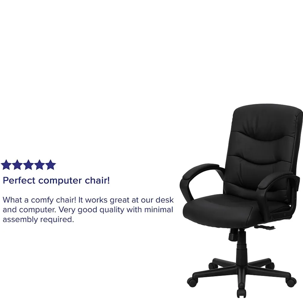 Upgrade your office seating with this mid-back black LeatherSoft upholstered swivel task office chair. A mid-back office chair offers support to the mid-to-upper back region. Chair easily swivels 360 degrees to get the maximum use of your workspace without strain. LeatherSoft is leather and polyurethane for softness and durability. The tilt lock mechanism rocks/tilts the chair and locks in an upright position while the tilt tension adjustment knob adjusts the chair’s backward tilt resistance. The pneumatic adjustment lever will allow you to easily adjust the seat to your desired height. This computer chair is perfect for the office or in the home. From behind the desk to the meeting room this chair can provide a seamless addition to your work space.