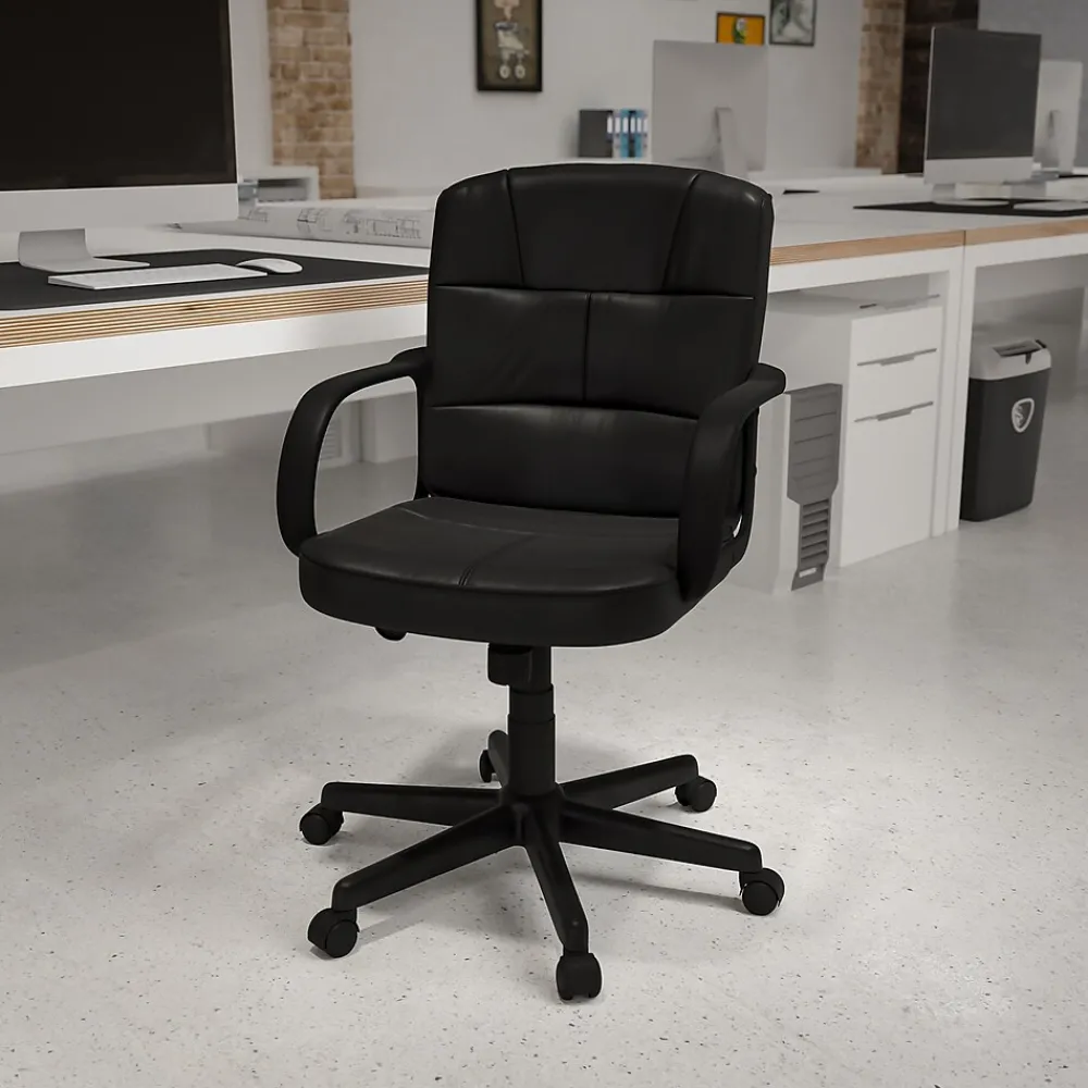 Create a visually appealing look in your office or reception area with this LeatherSoft upholstered, swivel office chair with arms. Mid-back office chairs are a great choice for workspaces where space may be tight, allowing you to move from one desk to another. A mid-back office chair offers support to the mid-to-upper back region prompting you to sit straight. Chair easily swivels 360 degrees to get the maximum use of your workspace without strain. A full range of adjustable features help your employees change the feel of this chair to meet their own personal preferences. With a spring tilt control mechanism, tilt tension control knob, upright tilt lock, and pneumatic seat height adjustment, this chair can be adjusted to fit each employee.