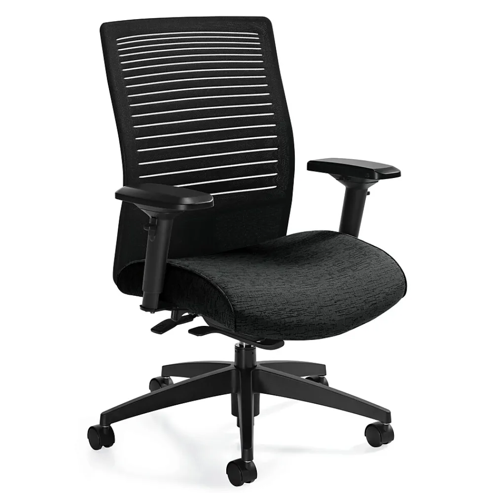 Global Loover Medium back fabric upholstered synchro-tilter in urban black coal color has sliding seat depth control and G5 arm caps fulfill user priority. Aluminum finish for attractive look while nylon governor base gives stability.