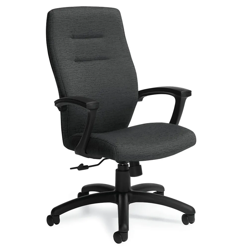 Equip employees with the Global executive chair to give them working comfort at their work station with the appeal of management-style design. The chair features standard ergonomic elements with a high S-curve back, double-stitched in shoulder tufting. The Global Synopsis urban fabric executive chair comes with a drop-front seat and fixed urethane armrests that are resistant to scuffing and denting.