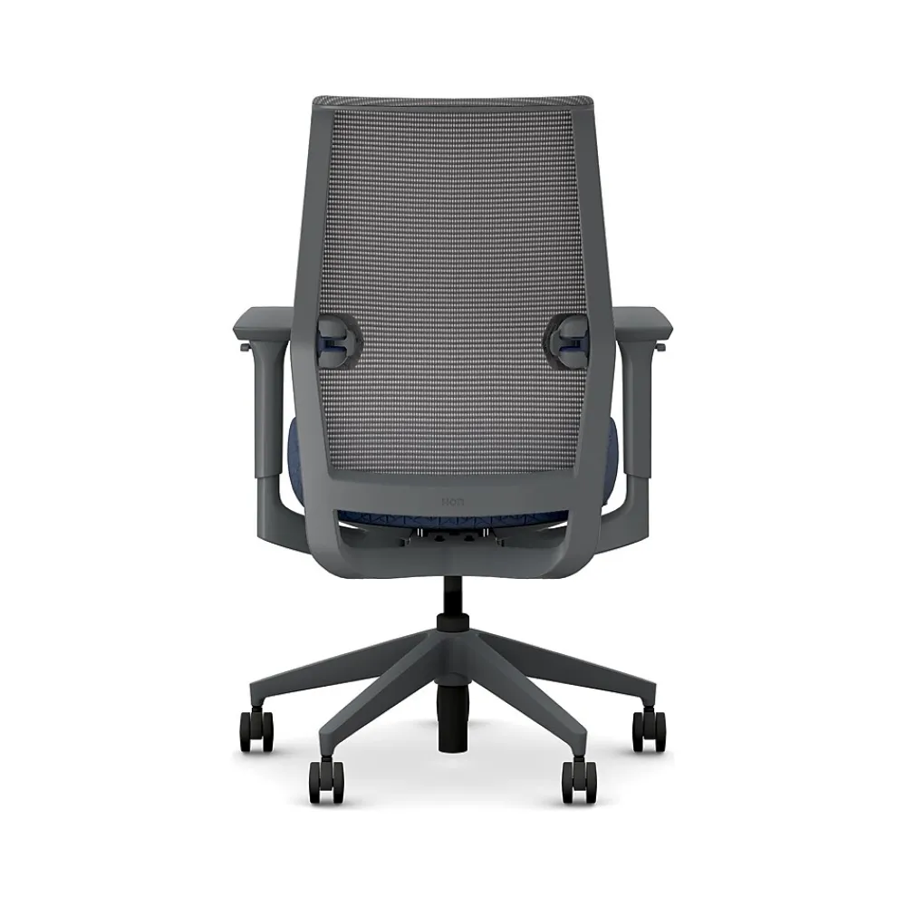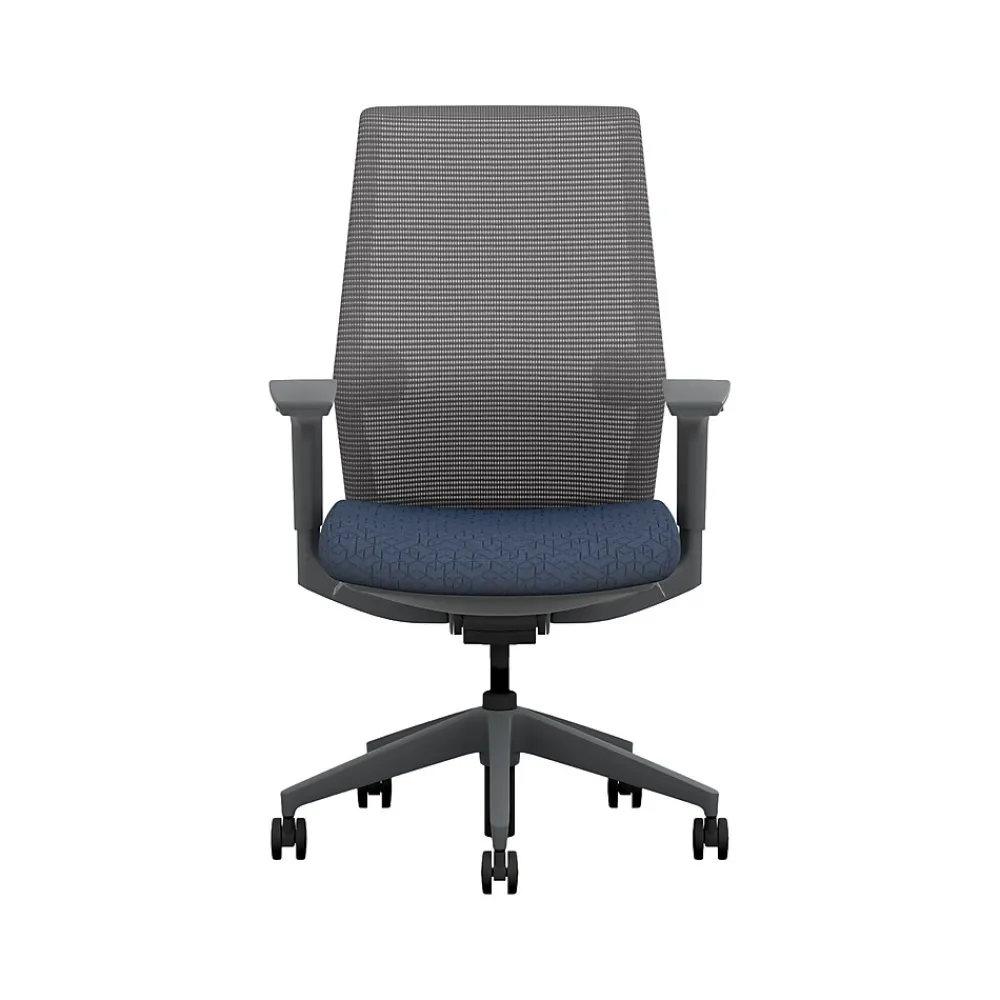 - Four-way stretch mesh back in charcoal gray, Apex navy fabric seat, and charcoal gray frame