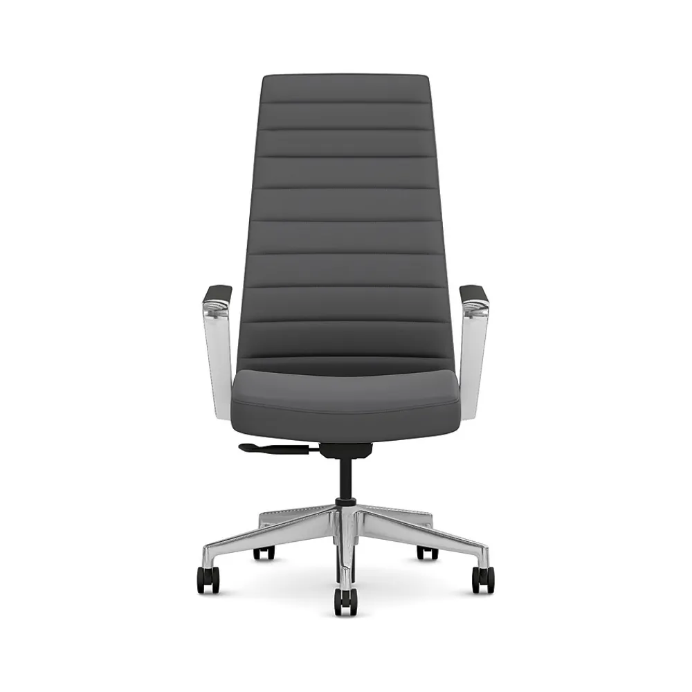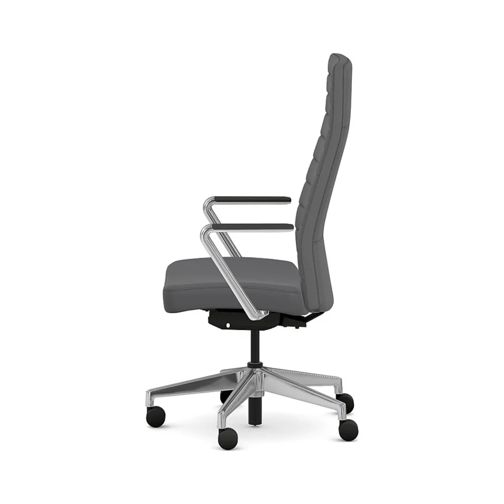 - Contourett graphite gray fabric upholstery with black stitching, and polished aluminum arms and base