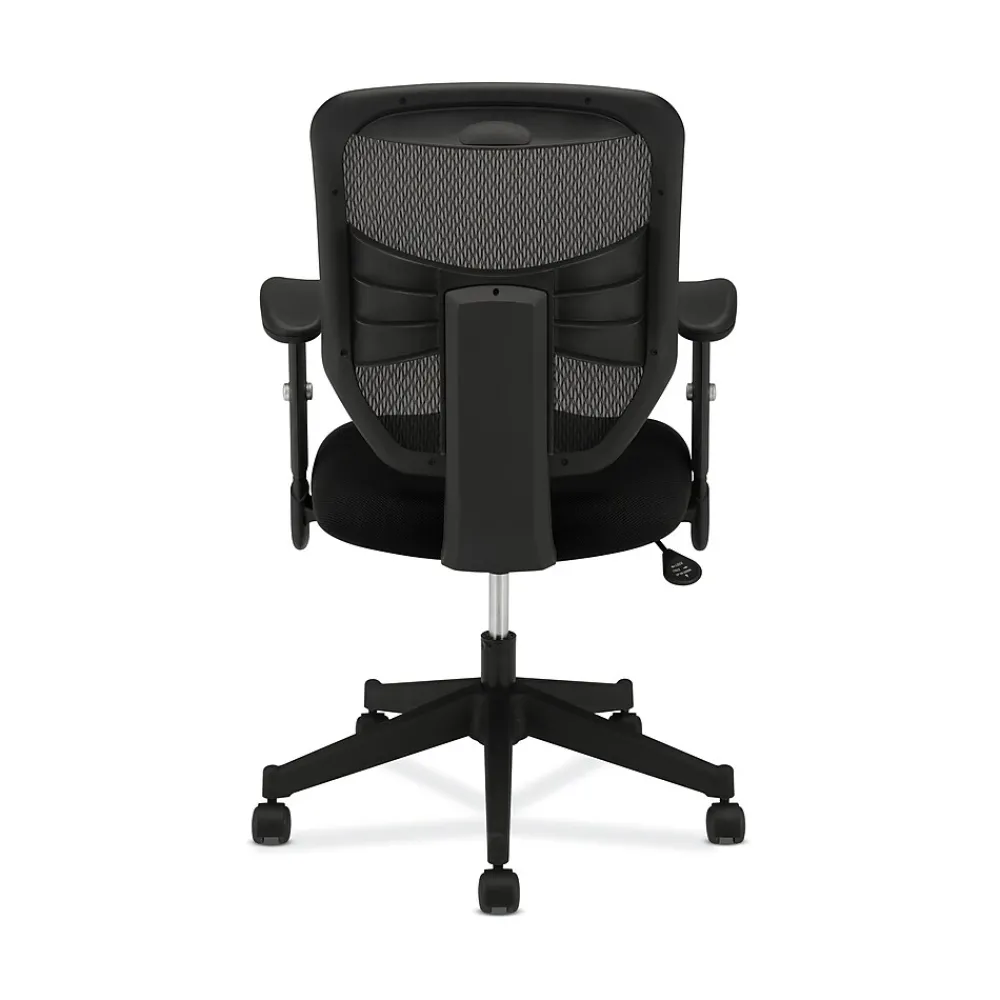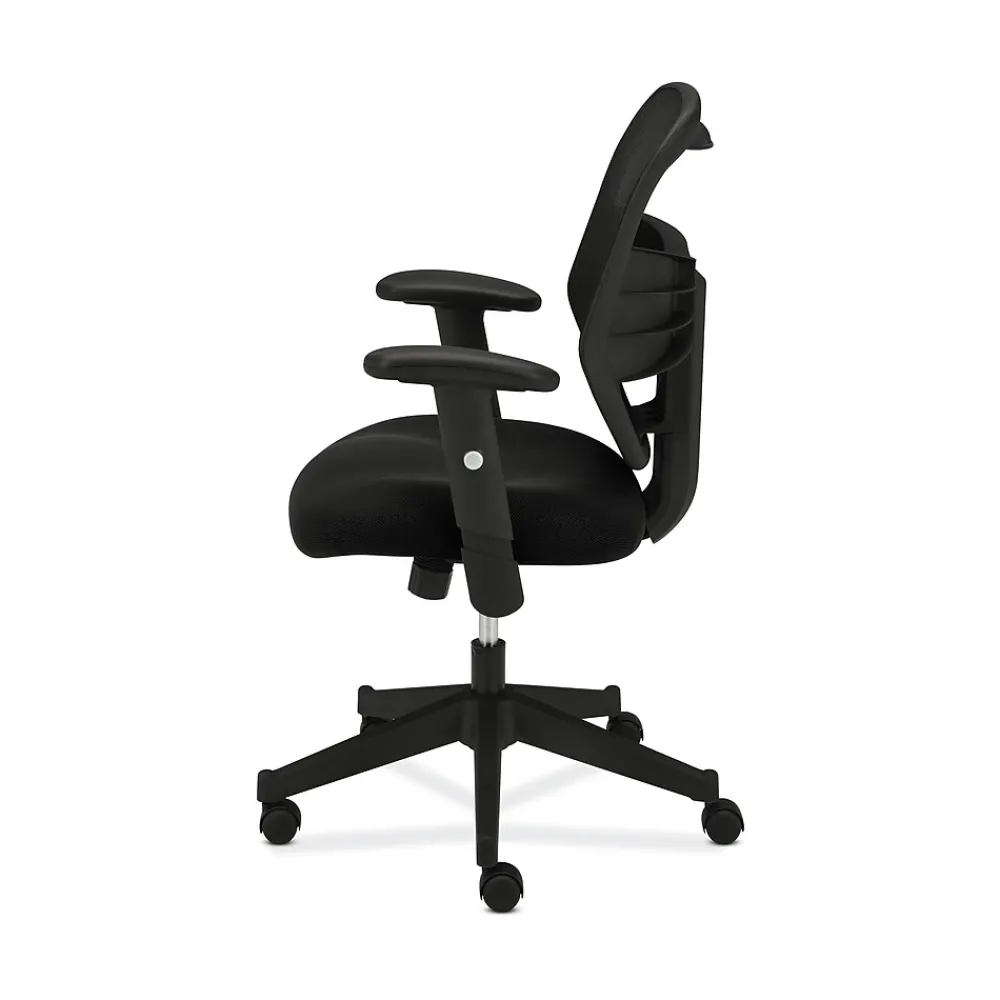 A mesh back, waveform seat and height-adjustable padded arms give this chair an upscale feel at a compelling price. Seat upholstery color is Black and back mesh color is Black.