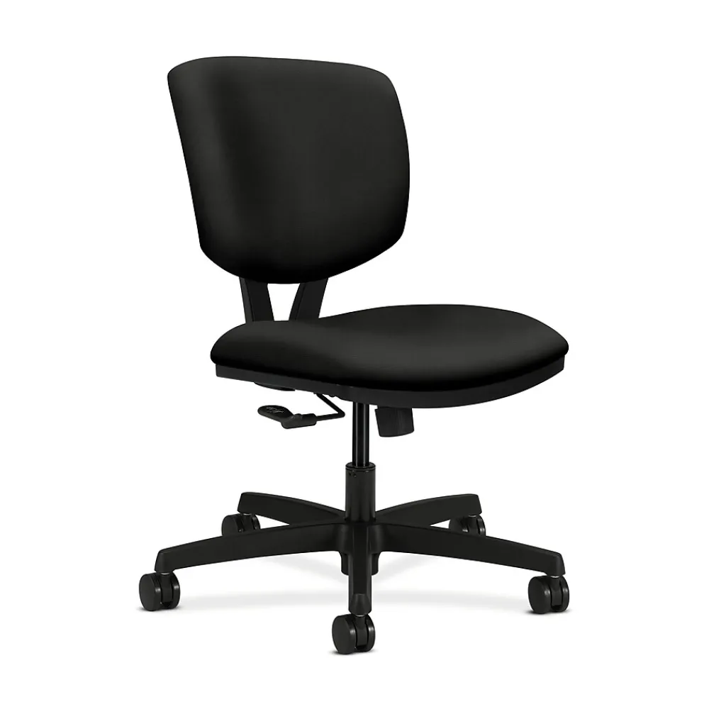 Volt seating from HON offers upscale style, full-scale comfort and impressive quality at a surprisingly affordable price. This low-back computer chair with center-tilt has generous seat and back cushions that are contoured for comfort while performing a ctive office work. Height-adjustable arms can be ordered separately. The seat and back upholstery color is black.