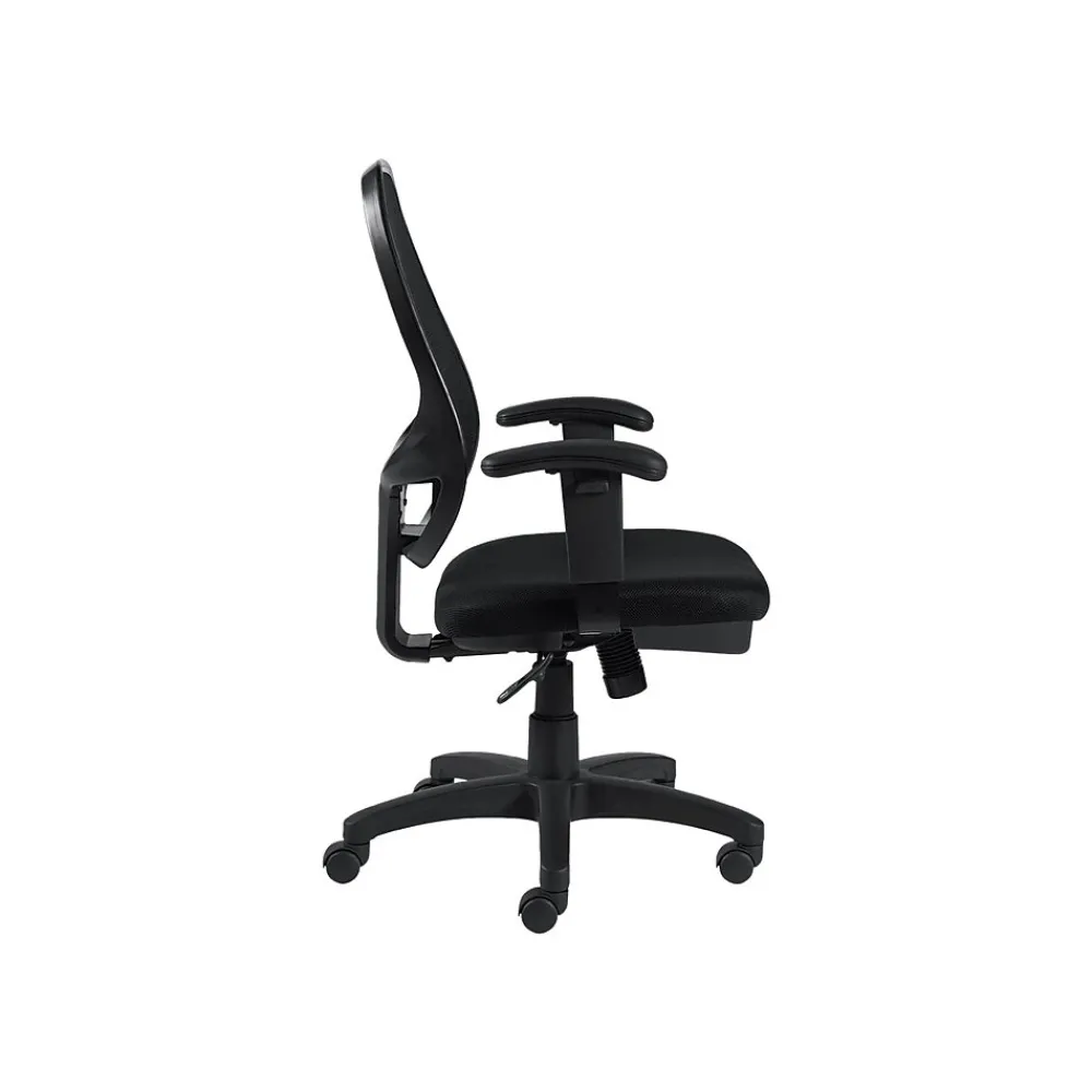 Create a more inviting seating arrangement in your workspace with this Office to Go high-back managers chair. With a scuff-resistant molded base and twin-wheel carpet casters, this office chair glides effortlessly across your floor. The breathable mesh upholstery and seat back allow for better air circulation, keeping you cool throughout the workday. Single-position tilt lock, center-tilt and tilt-tension control let you recline back in the seat at the perfect angle, while the pneumatic height-adjustment lever makes it easy to raise or lower the seat as needed. Boasting contoured height-adjustable arms, this Office to Go high-back managers chair provides added support for your shoulders, arms and hands.