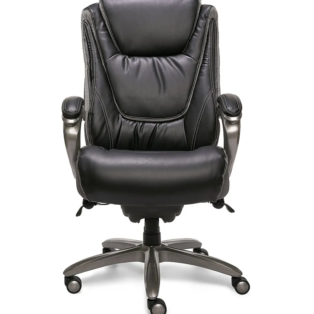 The Serta Big & Tall executive office chair brings the legacy of quality, comfort, and style to your office. Specialized premium foam makes up the smart layers that are placed over individual pocketed ComfortCoils, offering pressure-relieving comfort and optimized support for an unrivaled seating experience. The deep, layered body pillows on this leather office chair wrap you in softness, creating a plush feel that takes you comfortably through your day. Designed to help alleviate strain and discomfort, this ergonomic office chair has an elevated headrest to support your neck. This big and tall office chair accommodates up to 350 lbs. and has a generous, roomy seating area, so you can stay focused and productive without feeling constricted. Commercial-grade components like an extra-large steel plate and thicker plywood ensure this heavy-duty office chair stands up to heavy use. A great addition to your executive workspace, this Serta office chair is finished in a supple bonded leather for a commanding style that highlights success.
