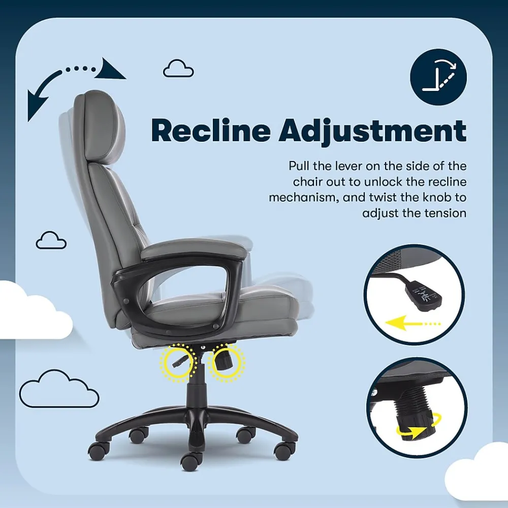 The better you sit, the better you’ll feel. Whether for work, play, or any other activity that has you sitting in our chairs, we believe comfort is everything. We know it’s a big responsibility and take it seriously, just as we do with our mattresses. With over 15 years of making chairs and innovating with designs, materials, and technology, Serta knows what it takes to give you a comfortable sit. The Serta Comfort series of office chairs offers a luxuriously cushioned seat, backrest, and armrests filled with thick, non-recycled Serta foam and upholstered in a soft breathable bonded leather to keep you cool and comfortable during extended use. This chair seamlessly blends its comfort with sleek design, accented by a single channel tuft. Choose from Black, Brown, Gray, or Cognac to find the perfect match for your workspace. This executive big & tall model is a high-back design which can be helpful for people who tend to experience discomfort due to long sitting periods. High-back chairs offer upper back, shoulder, and neck support and encourages proper spinal alignment by supporting the back in a neutral position which helps reduce muscle fatigue and promotes a better overall posture. The 360° swivel metal base on double-wheel casters glides smoothly across carpets or rugs, and can handle up to 350 lbs. Finding your ideal seated position is easy with the one-touch side lever for convenient height adjustment to match your work style and desk set-up. Whether you’re conquering emails or squeezing in work between kid duty and dog walks, the Serta Comfort Executive Big & Tall office chair will transform your home office into a command center of productivity.