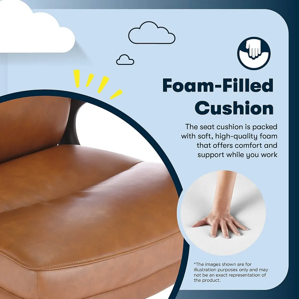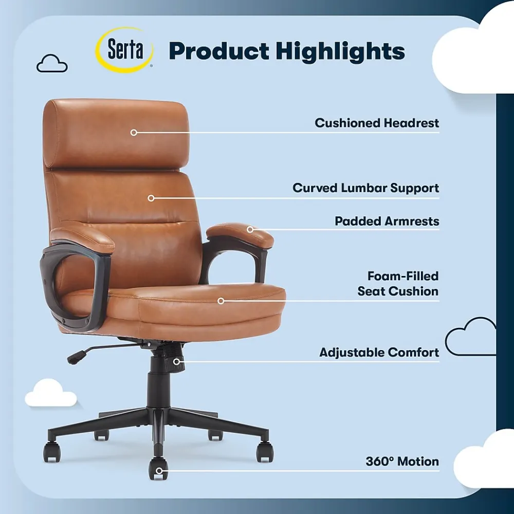 The better you sit, the better you’ll feel. Whether for work, play, or any other activity that has you sitting in our chairs, we believe comfort is everything. We know it’s a big responsibility and take it seriously, just as we do with our mattresses. With over 15 years of making chairs and innovating with designs, materials, and technology, Serta knows what it takes to give you a comfortable sit. The Serta Comfort series of office chairs offers a luxuriously cushioned seat, backrest, and armrests filled with thick, non-recycled Serta foam and upholstered in a soft breathable bonded leather to keep you cool and comfortable during extended use. This chair seamlessly blends its comfort with a sleek design accented by a single channel tuft. Choose from Black, Brown, Gray, or Cognac to find the perfect match for your workspace. This executive model is a mid-back design. Mid-back chairs can be beneficial for those who tend to slouch in high-back chairs, as the lower lumbar support encourages active sitting and prioritize core engagement. It will also enable you to shift positions and stretch more easily throughout the day, helping to prevent muscle fatigue and discomfort that can lead to poor posture. The 360° swivel metal base on double-wheel casters glides smoothly across carpets or rugs, and can handle up to 275 lbs. Finding your ideal seated position is easy with the one-touch side lever for convenient height adjustment to match your work style and desk set-up. Designed for comfort, but delivering stylish ergonomics, the Serta Comfort Executive Mid-Back Chair is your workday partner for crushing emails, pumping out a project or slaying your study time.