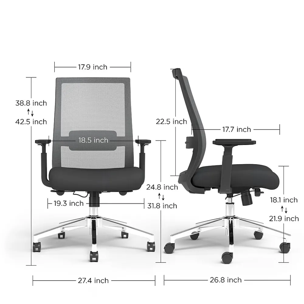 - Overall Dimensions: 38.7″-42.5″H x 27.4″W x 26.8″D ; Seat dimensions: 18.1″-21.9″H x 19.3″W x 17.7″D ; Back dimensions: 17.9″W x 22.5″H