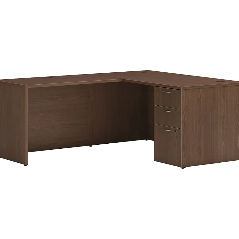 - L-shaped single-pedestal computer desk lets you protect what’s important and provides easy access to personal items, office supplies, and more
