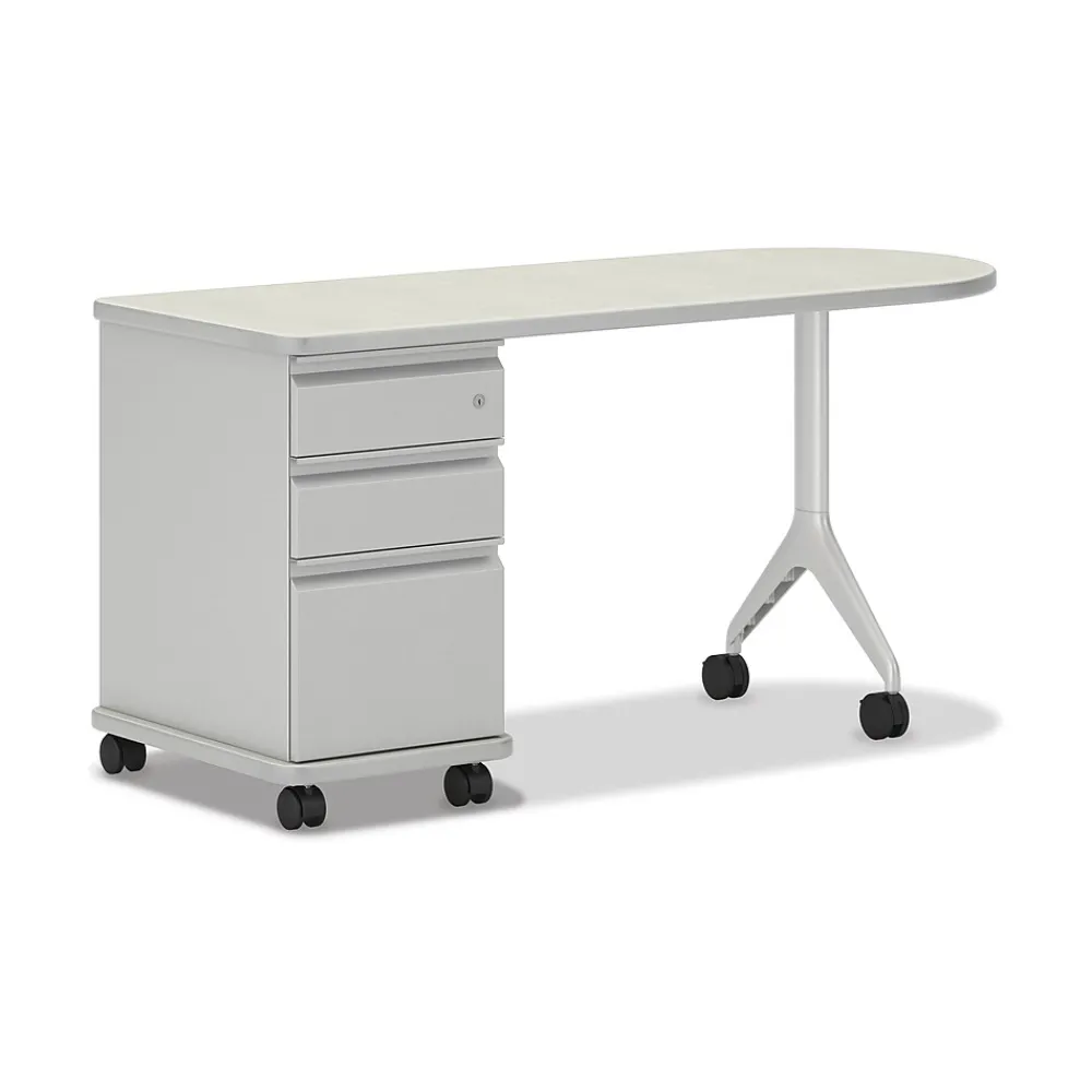 The ultimate teacher’s assistant is the HON SmartLink mobile teacher station that accommodates technology and includes storage to keep school supplies well-organized and lessons visual and dynamic. This value teacher’s station pedestal desk can be effortlessly wheeled anywhere in the learning environment, while offering the work surface and storage teachers need to stay on top of their lesson plans. The two box drawers provide tons of space for classroom supplies, while the file drawer accepts hanging files in either letter or legal format. The laminate finish is silver mesh; the edge band color is platinum; the modesty panel is platinum metallic.