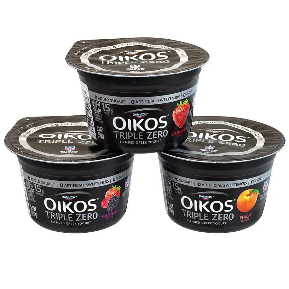 - An 18-Pack of 5.3-Ounce Dannon Oikos Triple Zero Blended Greek Non-Fat Yogurt Cups in a variety of 3 flavors
