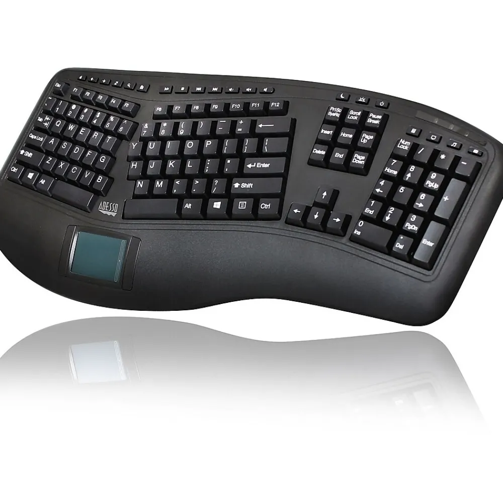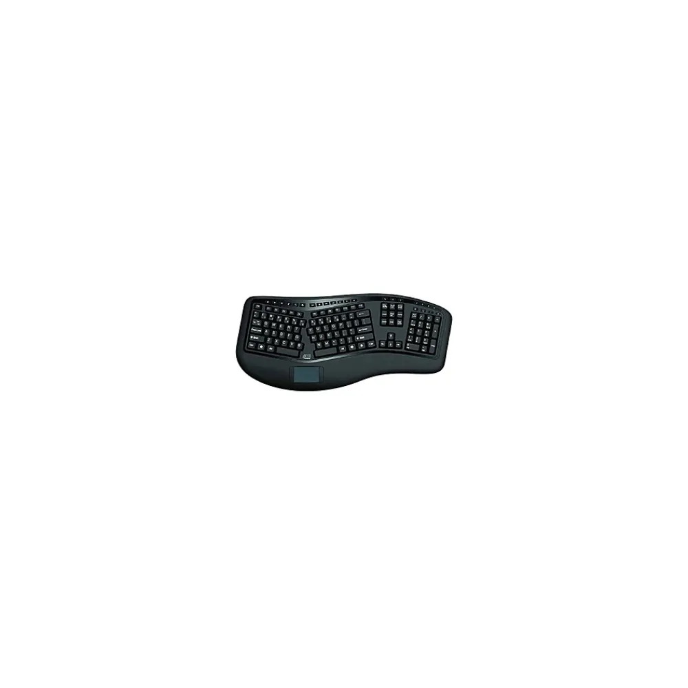 The Adesso 2.4GHz Wireless Ergonomic Touchpad Keyboard offers you an advanced input device with ergonomic design, multifunctional features and a wireless range of up to 30 feet. The design of this keyboard with splitted key zones and gently sloped encourages natural position of hands, wrists, and forearm in maximum comfort for long use. The keyboard also features an integrated touchpad which can take the place of your mouse, making it easier to control the movement of the cursor on your personal computer.