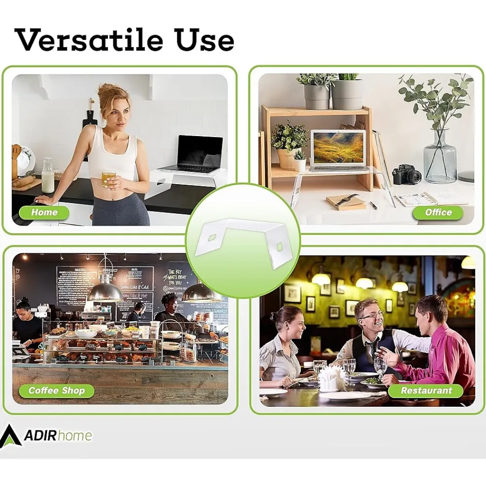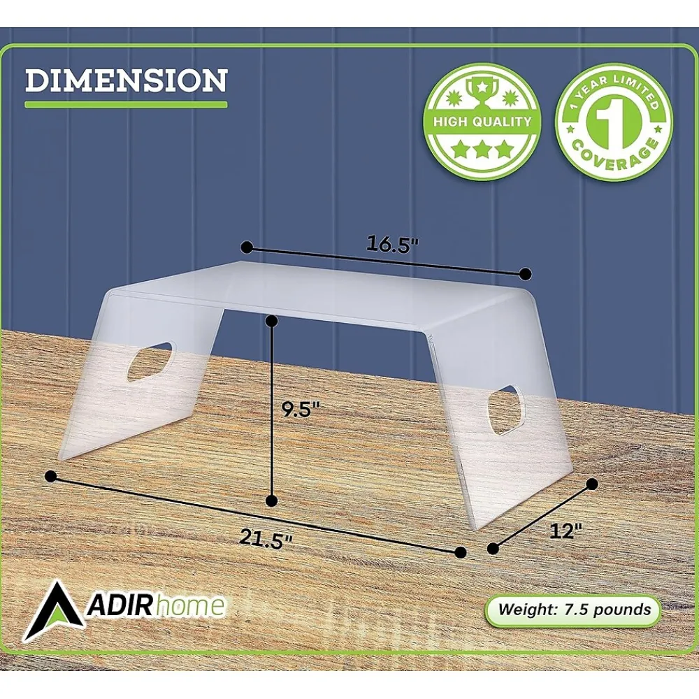 The AdirHome clear acrylic laptop and monitor stand is made to reduce eye and neck strain while accommodating a 21.5 in. wide laptop. This universal monitor stand is constructed of quality acrylic material with smooth edges and a beautiful clear platform to complement any desk or workstation. A keyboard can be stored under the AdirHome monitor stand to save desk space. Its portable mobile feature with cut-out hand holes on the sides, creates increased versatility to move your work space or leisure time wherever you need.