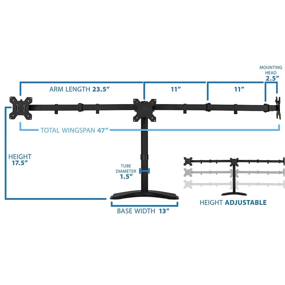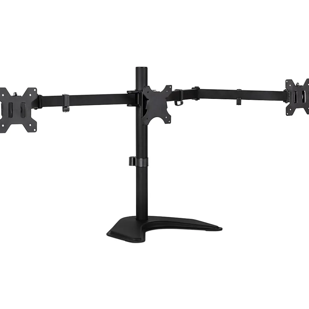 Mount-It! MI-2789 triple arm (horizontal) monitor mount and stand allows you to clear out your desk space, while providing ergonomic monitor installation height. Say good bye to neck and should pain and increase your productivity with three screens. Heavy duty stand and pole design makes this three monitor mount sturdy. Economical and dependable, mechanical monitor arms allow several height options for placing your monitor in the best ergonomic position, while offering more desktop space. The double link swing arms that support the monitors can be adjusted on the vertical tube for the best height adjustment. The arms that support the monitors can be adjusted on the vertical tube for the best height adjustment. Articulating arms on the sides allow swivel function up to 360 degrees with 45 down and 80 up degrees of tilt at the mounting panel.
