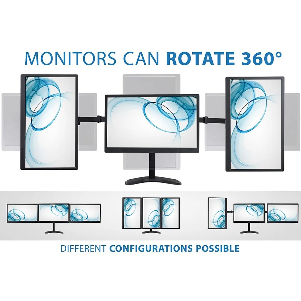 - FULLY ADJUSTABLE: 2 of 3 monitor stand outer arms can tilt 45 degrees up and down from center, swivel 360 degrees, and raise and lower on the middle pole. Middle screen can be height adjusted, tiled, and swiveled as well. All 3 screens can be placed and held in portrait or landscape orientation independent of one another. To align the height of the monitors, rotate the height adjustment screw behind each monitor VESA head to raise and lower each monitor up to 1 inch