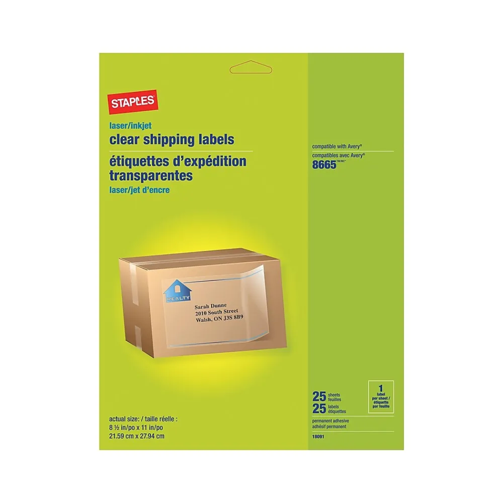 Put your own custom stamp on packages with these Staples inkjet/laser shipping labels. The clear format blends seamlessly with boxes and mailers for a sleek look. Each label features a self-adhesive backing, which stays firmly in place throughout the shipping process. These Staples inkjet/laser shipping labels work with most popular word processing programs, making it easy to create your own label designs.