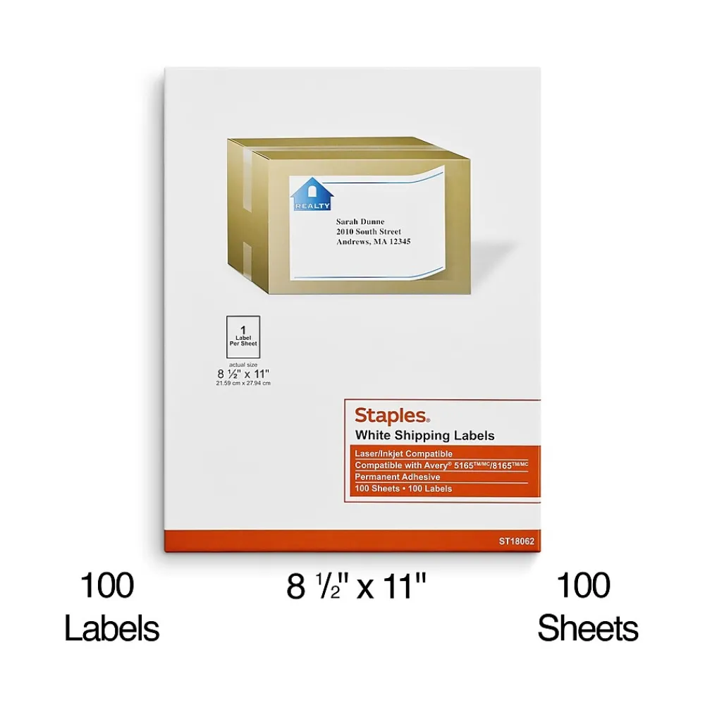 Create custom looks for your packages with these Staples full-sheet inkjet/laser shipping labels. The letter-size sheet format provides ample room for recipient and return addresses along with custom company logos. Each label boasts a bright white hue for sharp color contrast, and the permanent adhesive backings ensure permanent placement. These Staples full-sheet inkjet/laser shipping labels work with most word processing programs for effortless formatting.