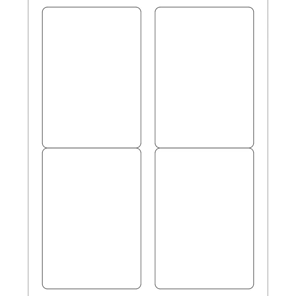 3 1/2″ x 5″ White Rectangle Laser Labels. Use to create your own product or mailing labels. Labels work with both Laser and ink jet printers. Permanent adhesive. Labels stick to a variety of smooth surfaces including paper, corrugated, plastic, wood, glass and metal.