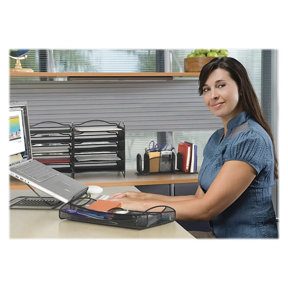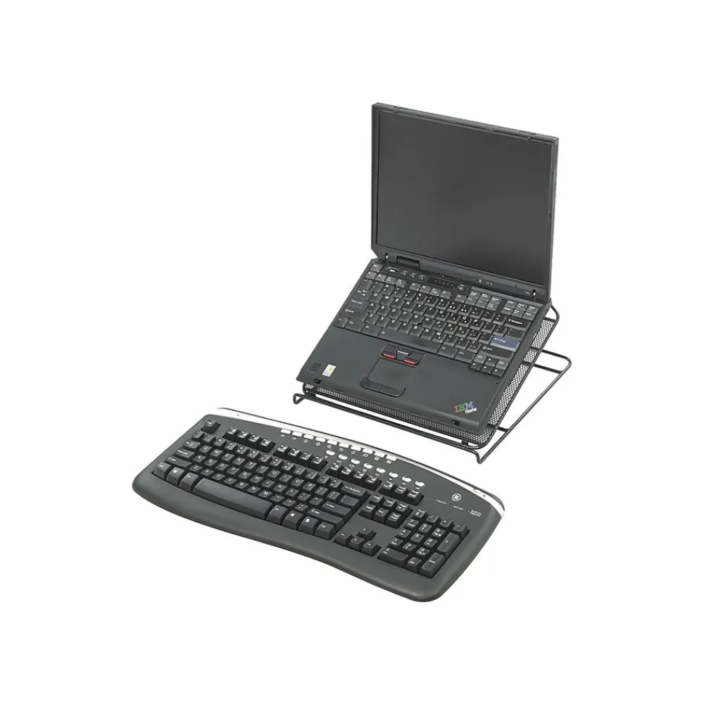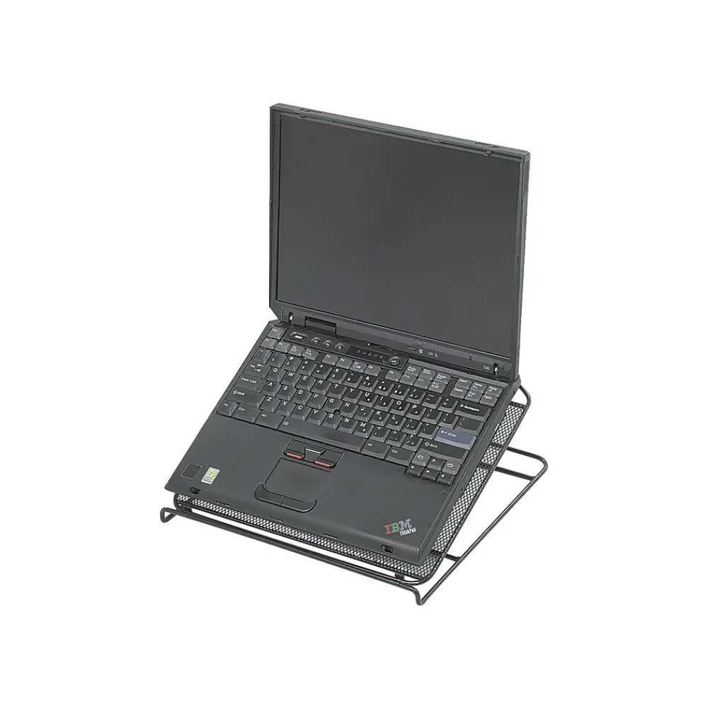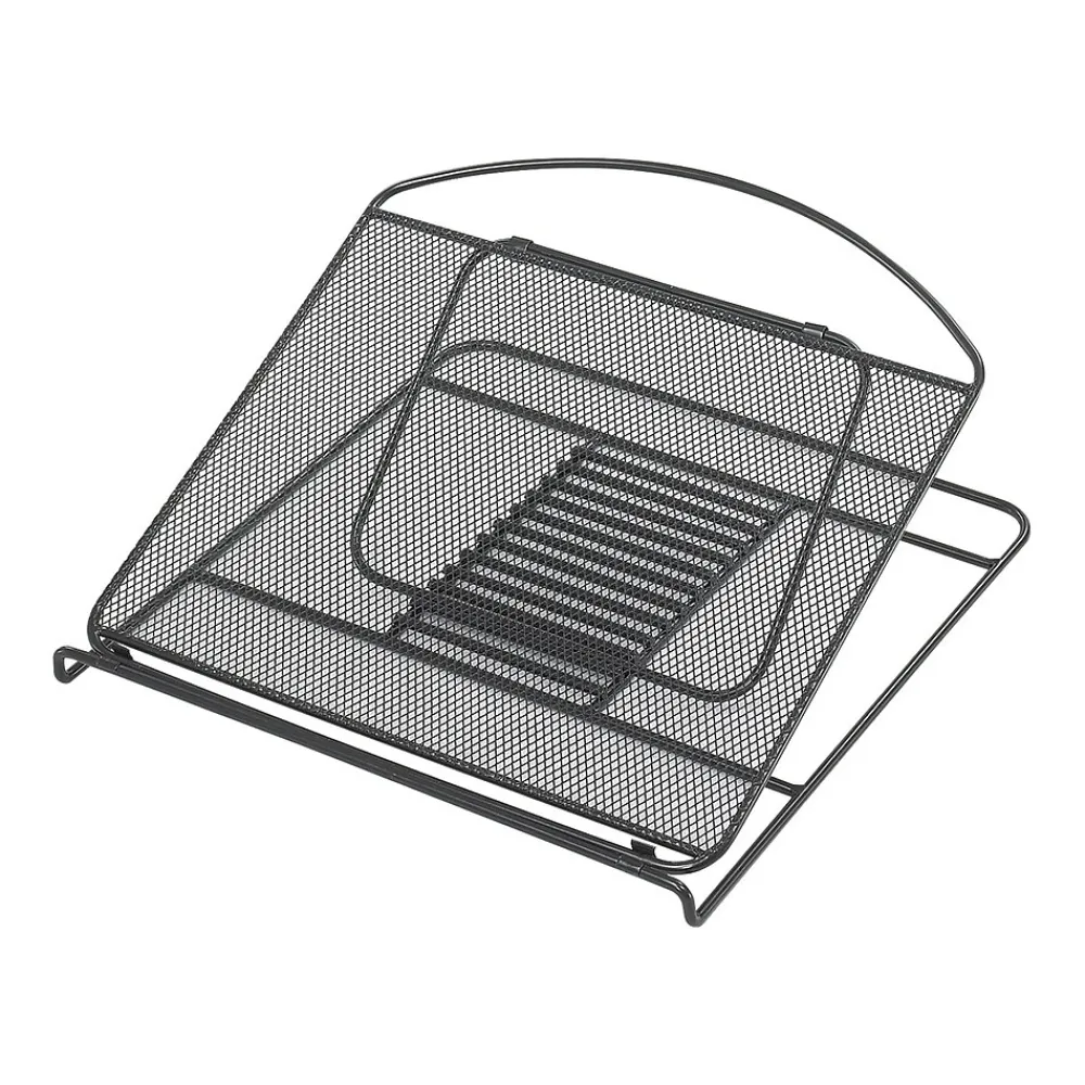 Protect your laptop from overheating with this mesh platform. Its powder-coated steel construction has a front lip to keep your device from slipping forward, and the notched base lets you set the optimum viewing angle for your screen when sitting at a desk or working from your bed. This Safco desk stand folds flat for storage, so you pack it along with your laptop.