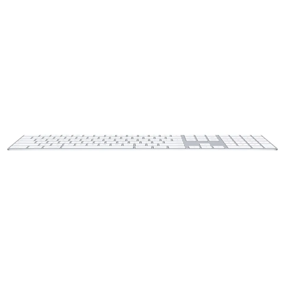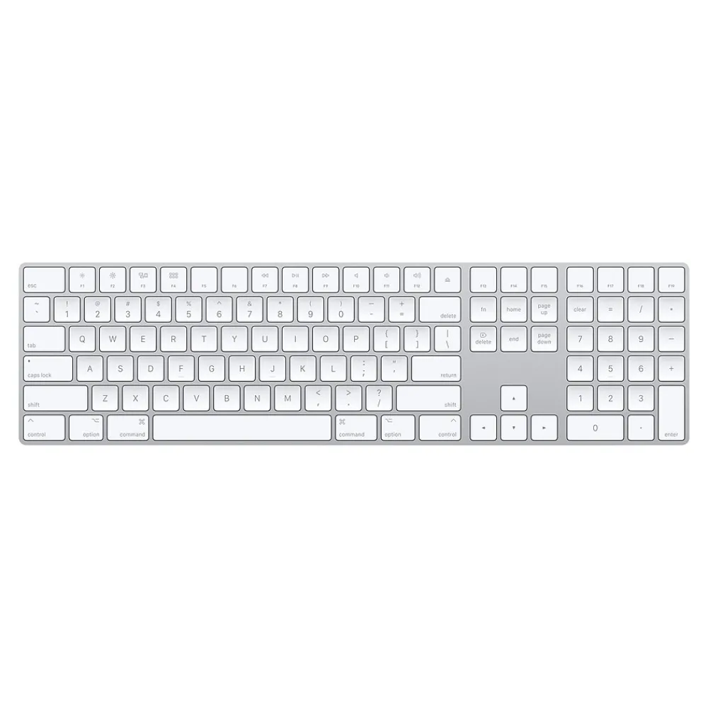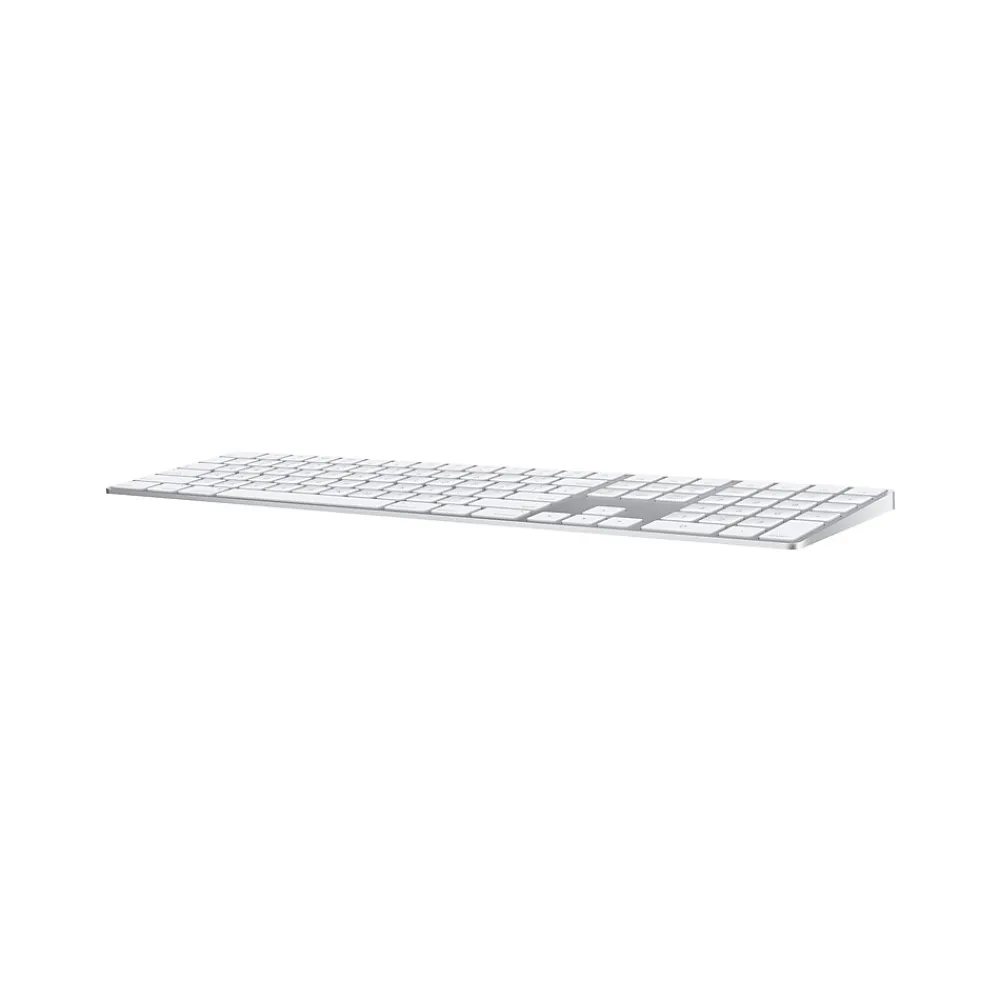 Type with precision using this wireless keyboard. Built to work seamlessly with Macs, this fully equipped keyboard can connect to any Bluetooth-enabled device that supports keyboards, including phones and tablets, and a number pad makes it simple to input data. A scissor mechanism under each key promotes good key return and stability. This Apple Magic wireless keyboard has a long-lasting rechargeable battery so you can work for days at a time.