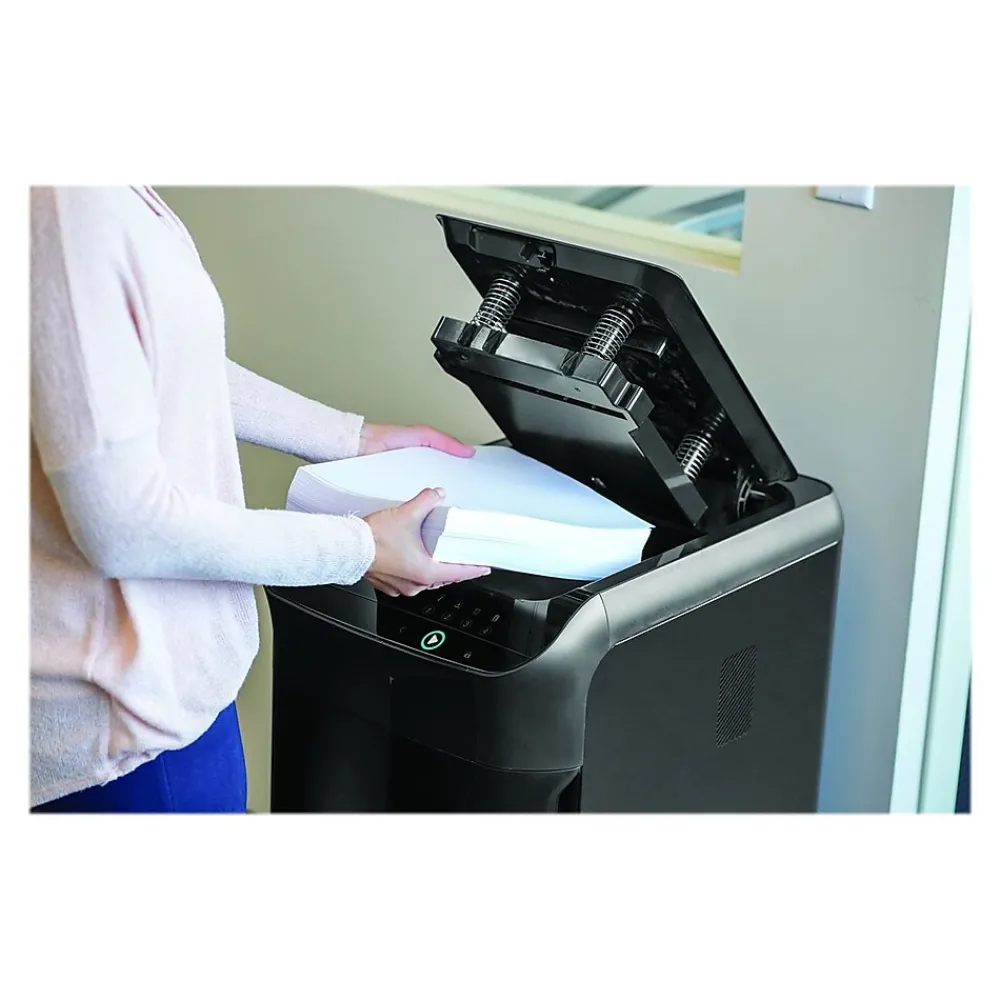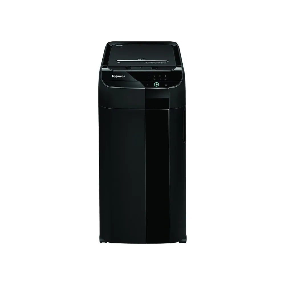 Make your way through thick stacks of old paperwork with this cross-cut shredder. The automatic feeder handles up to 350 pages for fast, efficient operation, while the powerful blades slice through glossy paper, credit cards, DVDs and CDs. With an automatic reverse function, this shredder prevents jams before they happen. Rolling casters make it easy to slide this shredder out of the way when it’s not in use. Featuring an 18-gallon waste bin, this Fellowes AutoMax cross-cut shredder keeps paper shreds contained until they’re ready for disposal.