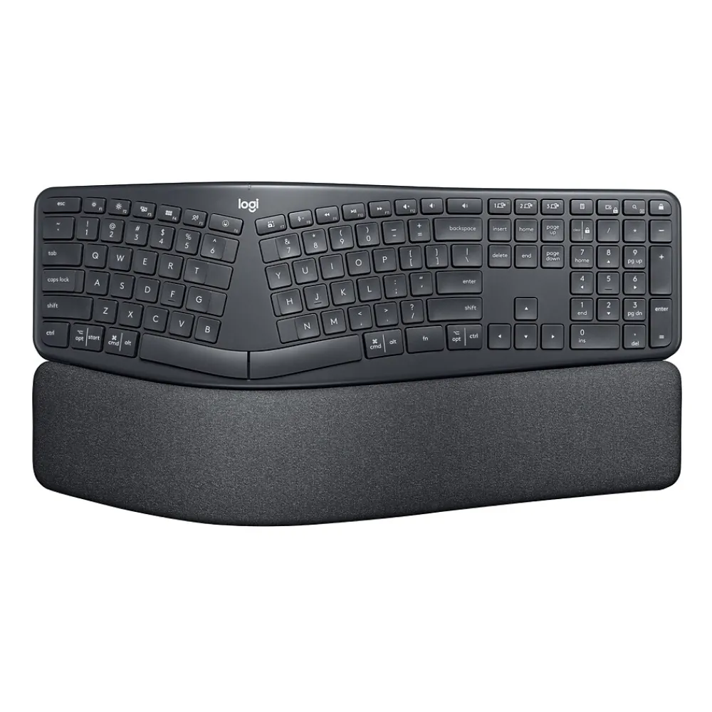 Type more naturally with ERGO K860 – an advanced ergonomic keyboard that promotes a more relaxed typing posture – reducing wrist bending by 25% and offering 54% more wrist support. The curved, split keyframe reduces muscle strain on your wrists and forearms. And the pillowed wrist rest offers comfort and the optimal ergonomic position. The adjustable palm lift feature keeps your wrists in a natural posture, whether you’re seated or standing. You’ll confidently type on Perfect Stroke keys—crafted for precision and fluidity. And an integrated numpad, multi-device capabilities, and two-year battery life ensure that you won’t compromise performance for ergonomics.